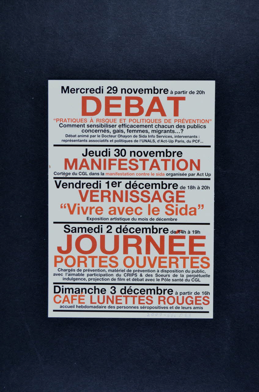 Programme des journées : "Mercredi 29 novembre / débat / Pratiques à risque et politiques de prévention. Comment sensibiliser efficacement chacun des publics concernés, gais, femmes, migrants...? / Débat animé par le Dr Ohayon de Sida Info Service, intervenants représentants associatifs et politiques de l'UNALS, d'Act-Up-Paris, du PCF... / Jeudi 30 novembre / Manifestation / Cortège du CGL dans la manifestation contre le sida organisée par Act Up. / Vendredi 1er décembre / Vernissage "Vivre avec le sida " / Exposition artistique du mois de décembre / Samedi 2 décembre de 14 h à 19 h / Journée Portes ouvertes / Chargés de prévention, matériel de prévention à disposition du public, avec l'aimable participation du CRIPS et des Soeurs de la perpétuelle Indulgence, projection de film et débat avec le pôle santé du CGL. / Dimanche 3 décembre / café Lunettes rouges / accueil hebdomadaire des personnes séropositives et de leurs amis."