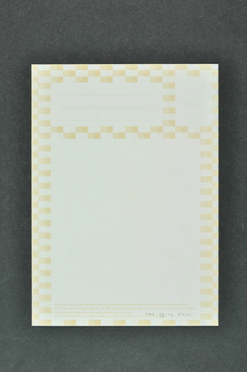 De forme rectangulaire, la carte postale en carton se lit verticalement. Au recto figure la photographie couleur d'une femme en buste sur un fond rouge. A gauche de son visage se trouve un phylactère rectangulaire contenant des inscriptions noires et blanches. En dessous des inscriptions noires et blanches sont imprimées sur un rectangle orange. Tout autour du recto est disposé un damier blanc, rouge, orange et noir aux bords irréguliers. Au verso, sur un fond blanc, on retrouve un damier dans les tons beiges à orange. Le damier délimite les espaces dédiés au timbre et à l'adresse. En partie inférieure apparaissent des inscriptions beiges.Inscriptions