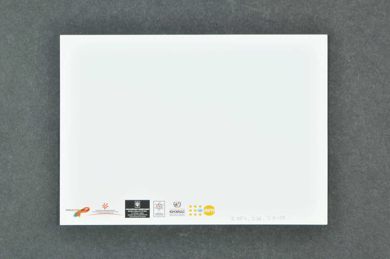 Elle est imprimée en couleur et est écrite en cyrillique. Au recto, à gauche il y a la représentation d'un tableau, un paysage urbain où cinq jeunes gens font une course de relais. A droite, un texte, en cyrillique, écrit en noir et rouge sur un fond blanc. Au verso, le fond et blanc. Six logos figurent en bas à gauche, deux sont inscrits en anglais.Décor