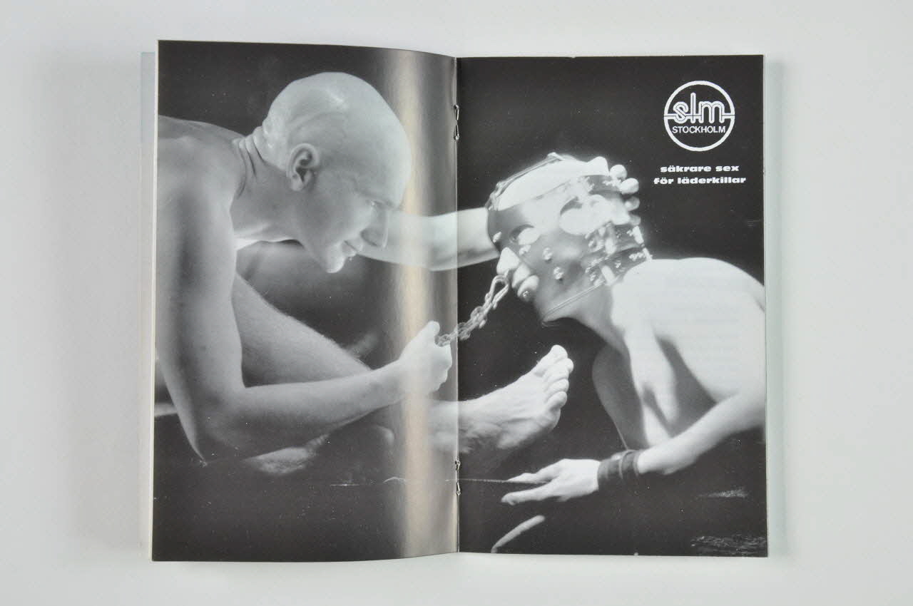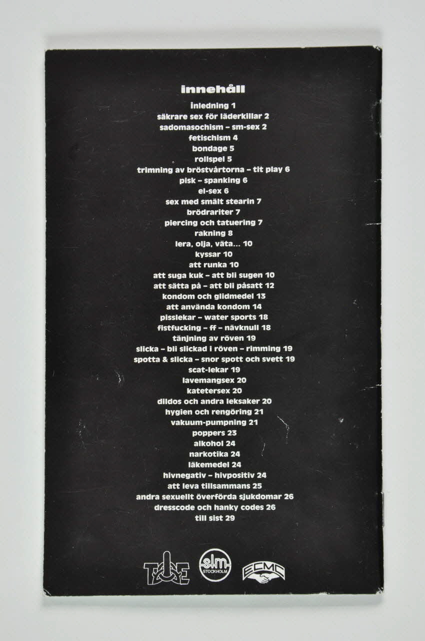 Couverture fond noir. En haut, à droite, en vignette, petite photo noir et blanc de piercing et chaîne. En dessous, en petites capitales blanches : "Säkrare sex för läderkillar" (Safe sex pour les porteurs de cuir).Tout en bas,en blanc également : "SLM. Scandinavian leather men". Dos fond noir. En blanc, en colonne, le sommaire.Tout en bas, trois logos :TOE, SLM, ECMC. Intérieur. Fond blanc, impression en noir sur deux colonnes. Titre de l'introduction en noir sur bandeau bleu. Titres de paragraphes en caractères gras noirs. Petits slogans en capitalesblanches sur bandeau bleu. Nombreuses photos noir et blanc de pratiques sexuelles entre hommes (environ 1 par page) Sommaire -