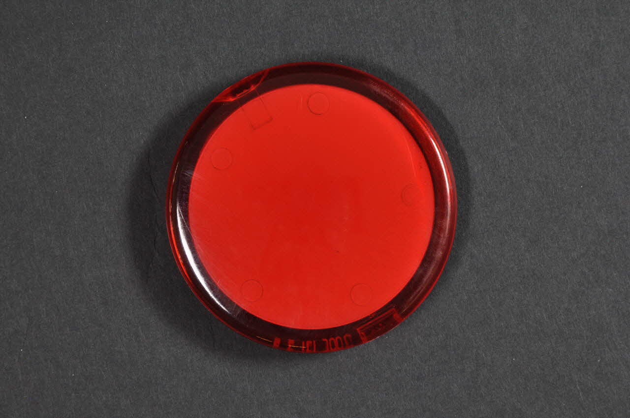 Petit miroir de poche, double, en plastique rouge de forme ronde. Les deux parties de l'objet sont réunies par une charnière.Inscriptions