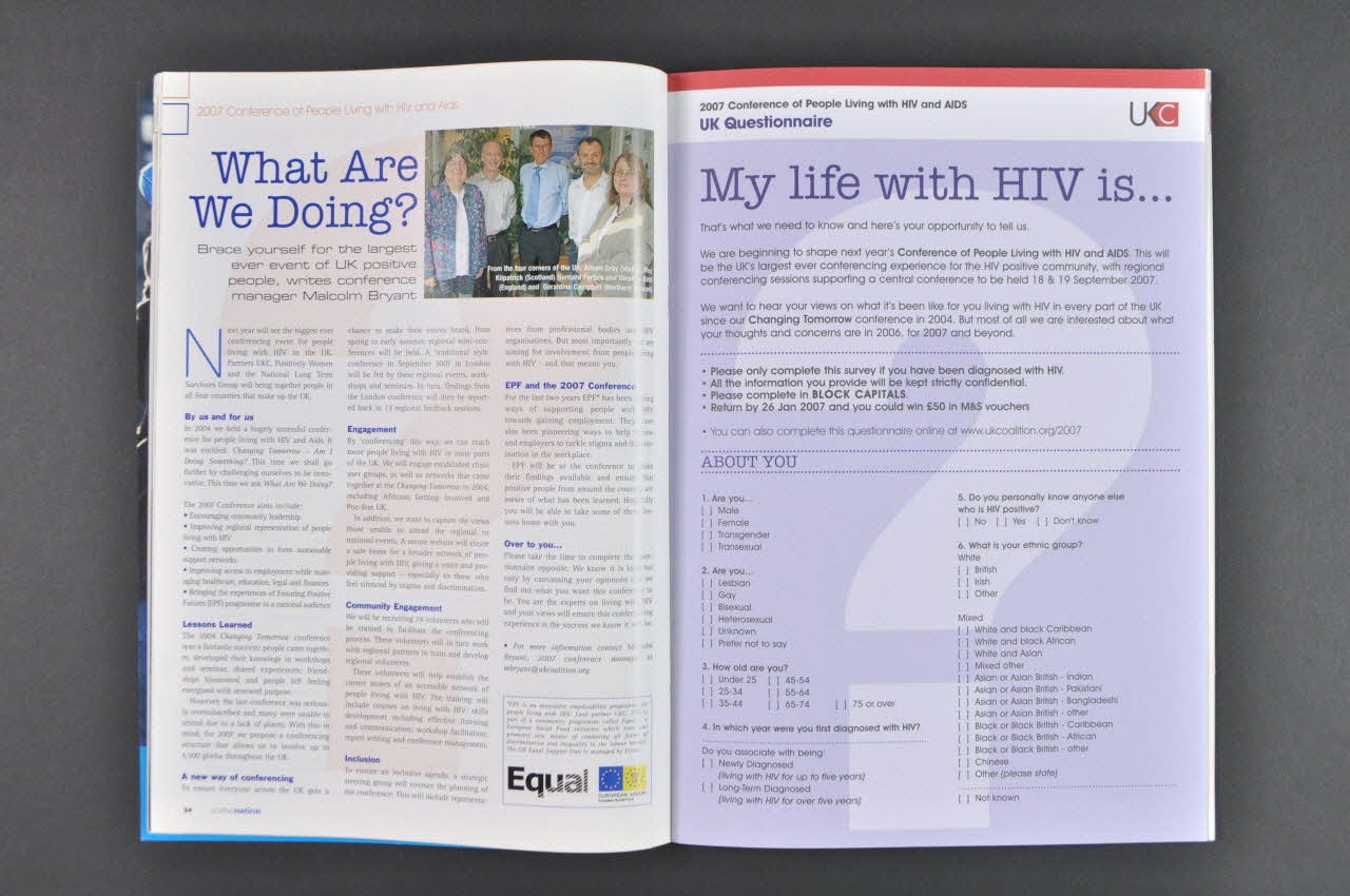 UKC (En bas, à droite, logo de UK Coalition of people living with HIV/Aids), sur la couvertureTitre