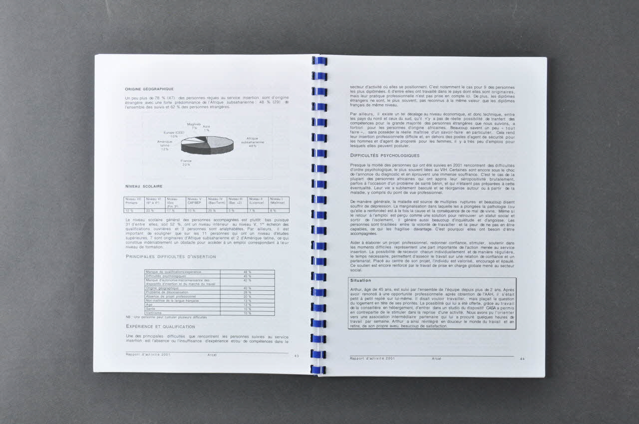 Sommaire - Introduction générale : changement de nom de l'association : Arcat-sida devenue Association de Recherche, de Communication et d'Action pour l'accès aux Traitements (épidémie de sida mais autres questions de santé récurrentes chez les personnes vulnérables : coinfections, tuberculose, hépatites). Journal du sida devient Journal de la démocratie sanitaire. - Organigramme - Financeurs PREVENTION - FORMATION - Migrants asiatiques : Origine du programme / Les séances de sensibilisation / Les appels téléphoniques / Les visites / Les accompagnements / Les documents élaborés / Constats et contraintes rencontrées - Migrants hispanophones : Rappel des origines du programme / Mise en oeuvre du programme et création d'un réseau / Propositions recueillies / Actions menées / Travaux en cours - Formation : Descriptif de l'action (diminution des demandes provenant de professionnels du fait de leur démobilisation) / Matériel pédagogique : Réponses à appels d'offres / prospection de centres de formation - Prévention et intervention en entreprise : Sensibiliser les salariés / Accompagner les professionnels sanitaires et sociaux de l'entreprise SECTEUR SOCIAL (description de l'activité et exemples de situation) - Point solidarité : Accueil / L'accompagnement des suivis / Sensibilisation à l'euro / Conseil social / L'accès aux droits et aux soins / L'accès à l'hébergement et au logement / L'insertion sociale et professionnelle / les aides financières / Les rencontres partenaires - Conseil médical : Description de l'activité / Bilan chiffré / Profil médical des personnes reçues / Motifs des demandes - Conseil juridique : Données sur les personnes accueillies / Appréciations / L'Observatoire du droit à la santé des étrangers - Soutien psychologique : Données générales / Données sur les personnes reçues / Données psychologiques / Difficultés rencontrées - Insertion professionnelle : Profil des personnes suivies / Principales difficultés d'insertion / Expérience et qualification / Difficultés psychologiques / Manque d'autonomie et méconnaissance du monde du travail / Nature des demandes et orientation / Objectifs du service insertion - Coordination des actions sociales en appartement (CASA) : Présentation du service CASA / Profil des personnes hébergées / Constats et nouvelles pratiques / Nos partenaires - MIJAOS : L'écoute et le soutien psychologique / L'accès aux droits administratifs / L'accès au logement et à l'hébergement / L'insertion sociale et professionnelle / Conclusion / profil socio-démographique de la file active SECTEUR MEDICAL ET THERAPEUTIQUE - Actions VIH : Répertoire national des essais thérapeutiques / Site internet / Guide des combinaisons d'antiprotéases / Travaux divers / Contribution au Journal de la démocratie sanitaire - Action Hépatites et coinfections : Faire connaître ARCAT dans sa nouvelle mission / "Hépatites Actualités" / Arcat courrier thérapeutique / Participation aux rencontres professionnelles / Action Hépatites et présence interassociative / Le Collectif Hépatites Virales (CHV) / Association française des hémophiles / Le formation / Site internet - Action TRT5 LE JOURNAL DU SIDA ET DE LA DEMOCRATIE SANITAIRE LES EDITIONS - Documents parus en 2001 : Rapport d'activité 2000 / European Aids Directory 2001 / Recherches thérapeutiques VIH-sida : enjeux éthiques - Documents en cours fin 2001 : La séropositivité au VIH / Dépliant : "Participer à un essai thérapeutique" / Dépliant présentant les actions du secteur social / Document présentant le nouveau projet de l'association. - Diffusion 2001 : Livres et brochures / Dépliants INTERNET - Réactualisation et mise à jour du site : Création de rubriques et de nouvelles pages web / Statistiques du site web SECTEUR COMMUNICATION - Communiqués de presse - Arcat-sida dans les médias RAPPORT MORAL BILAN FINANCIER ANNEXES - Prévention en entreprise - Prévention en milieu asiatique - Participation aux colloques