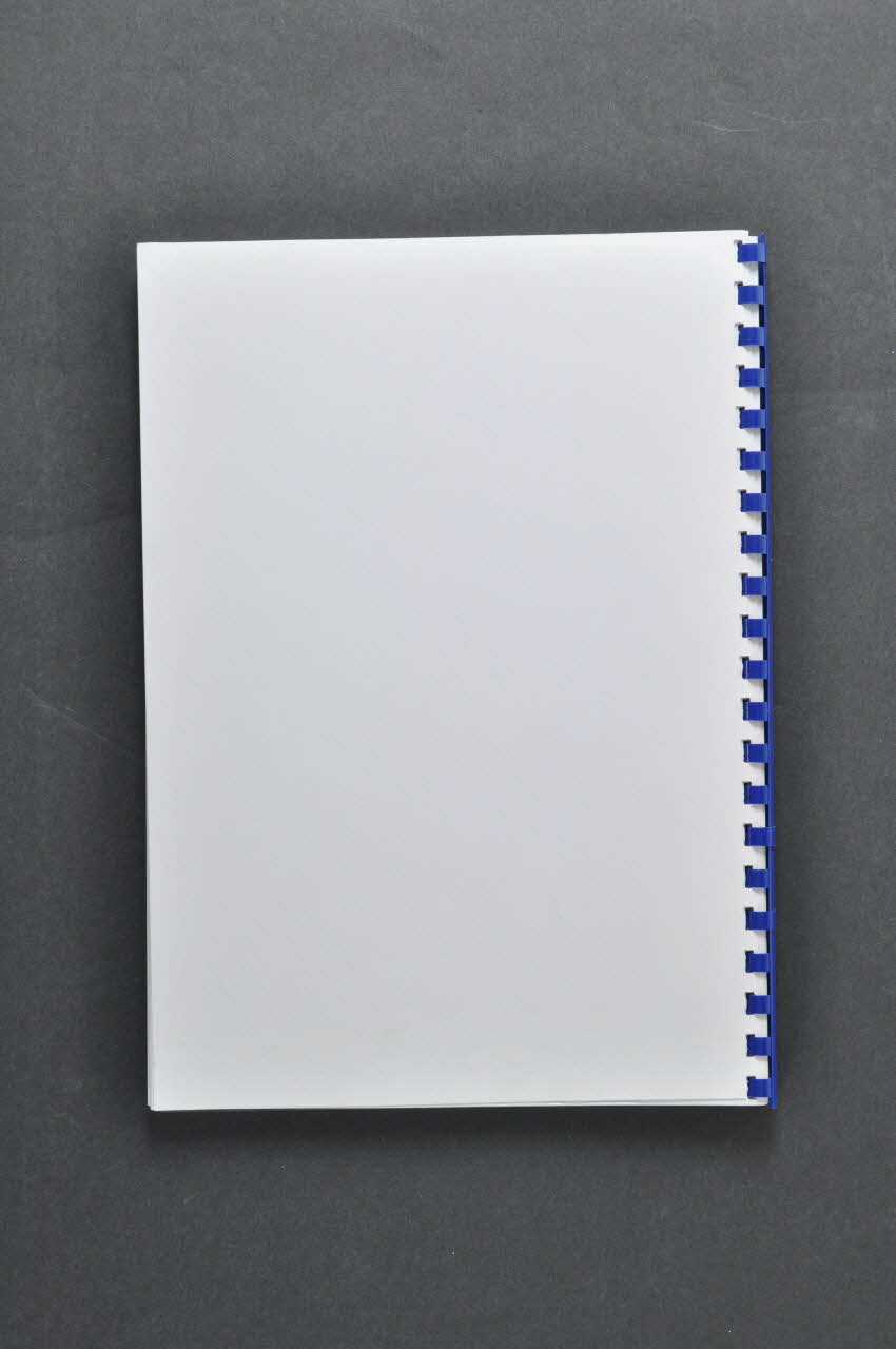 Rapport d'activité imprimé sur une centaine de pages de papier blanc, reliées sous uns couverture protégée par une feuille de plastique transparente, par une reliure en anneaux bleus en matière plastique.