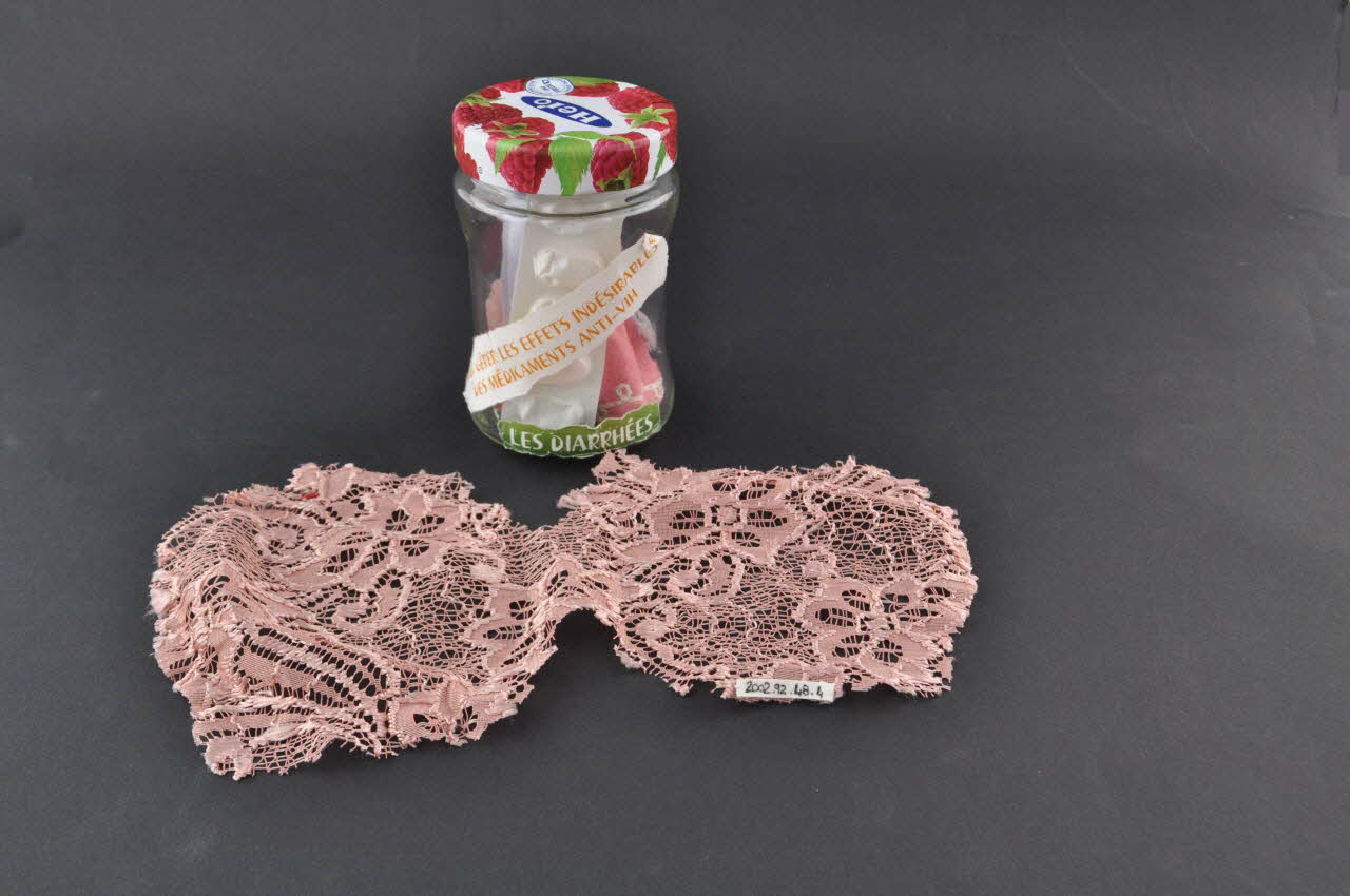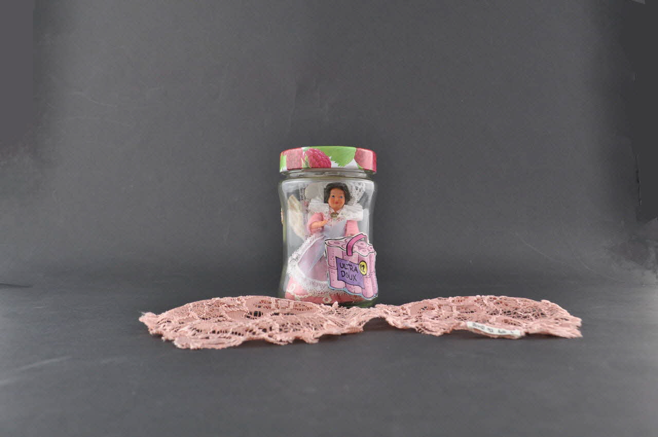 Bocal en verre, fermé par un couvercle plat, vissé. Sur le couvercle est fixé par un élastique rouge, un tissu de dentelle rose. Collé en biais sur l'extérieur du pot, un bandeau blanc porte une inscription en caractères orange. Collé également sur l'extérieur un dessin de douze rouleaux de papier hygiénique "ultra doux".
