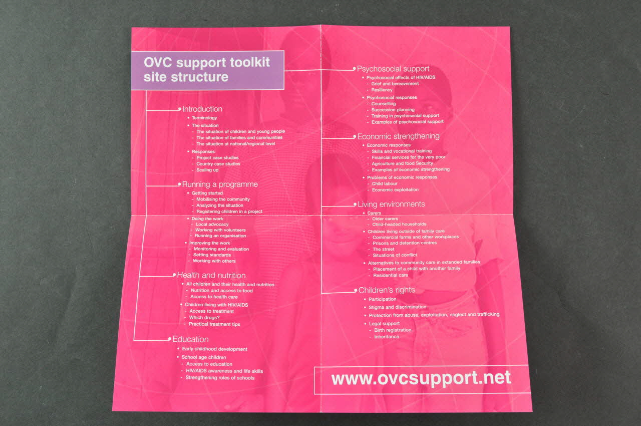 Le dos du dépliant est divisé en deux parties. Le haut a un fond rose et le bas un fond violet, des impressions en blanc nous présentent le CD qui est à destination des ONG, des autres organisations et des individus travaillant avec ces enfants. Existe aussi en site internet régulièrement mis à jour. Il s'agit d'une organisation en 70 thèmes et sous thèmes avec pour chacun une introduction. Le cd est en anglais mais certaines ressources sont en français, espagnol, portugais et russe.