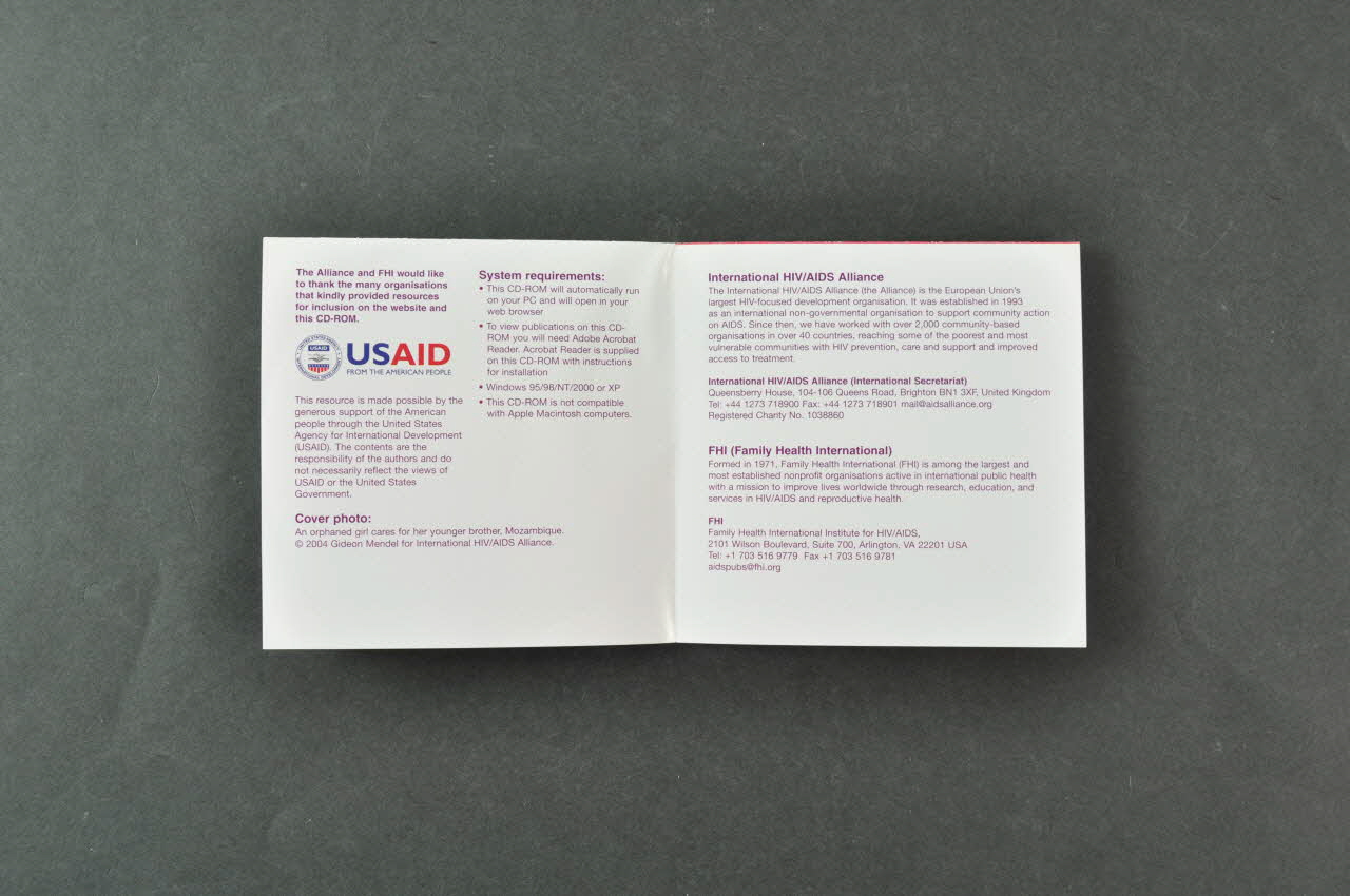 A l'intérieur du dépliant, les feuillets 1 et 2 ont un fond blanc, avec des impressions en violet : on y trouve une description technique du CD / support financier de USAID (logo) et présentation des deux associations : International HIV/AIDS Alliance et Family Health International. Sur les feuillets 3 à 6, c'est un dépliant à fond rose, avec en sous impression ton sur ton une famille africaine.
