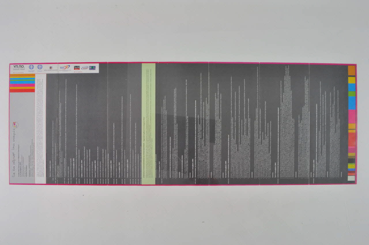 De forme rectangulaire, le dépliant en papier est plié en sept. Une fois déplié, il forme un poster imprimé en grec, qui se lit verticalement.