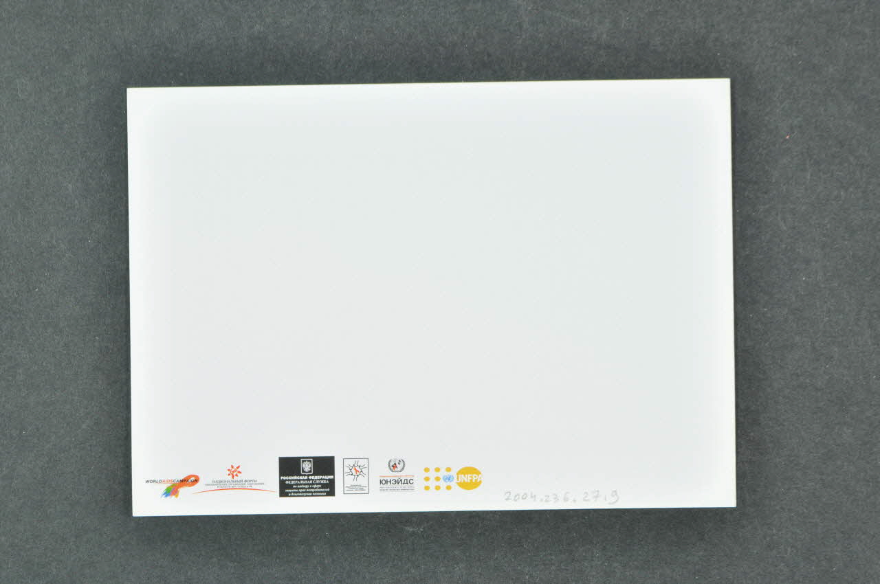Elle est imprimée en couleur et est écrite en cyrillique. Au recto, à gauche il y a la représentation d'un tableau, sur une pelouse, au bord d'un chemin, un bébé est assis, tout seul, il pleure. A gauche, on voit un autre enfant. A droite, un texte, en cyrillique, écrit en noir et rouge sur un fond blanc. Au verso, le fond et blanc. Six logos figurent en bas à gauche, deux sont inscrits en anglais.Décor