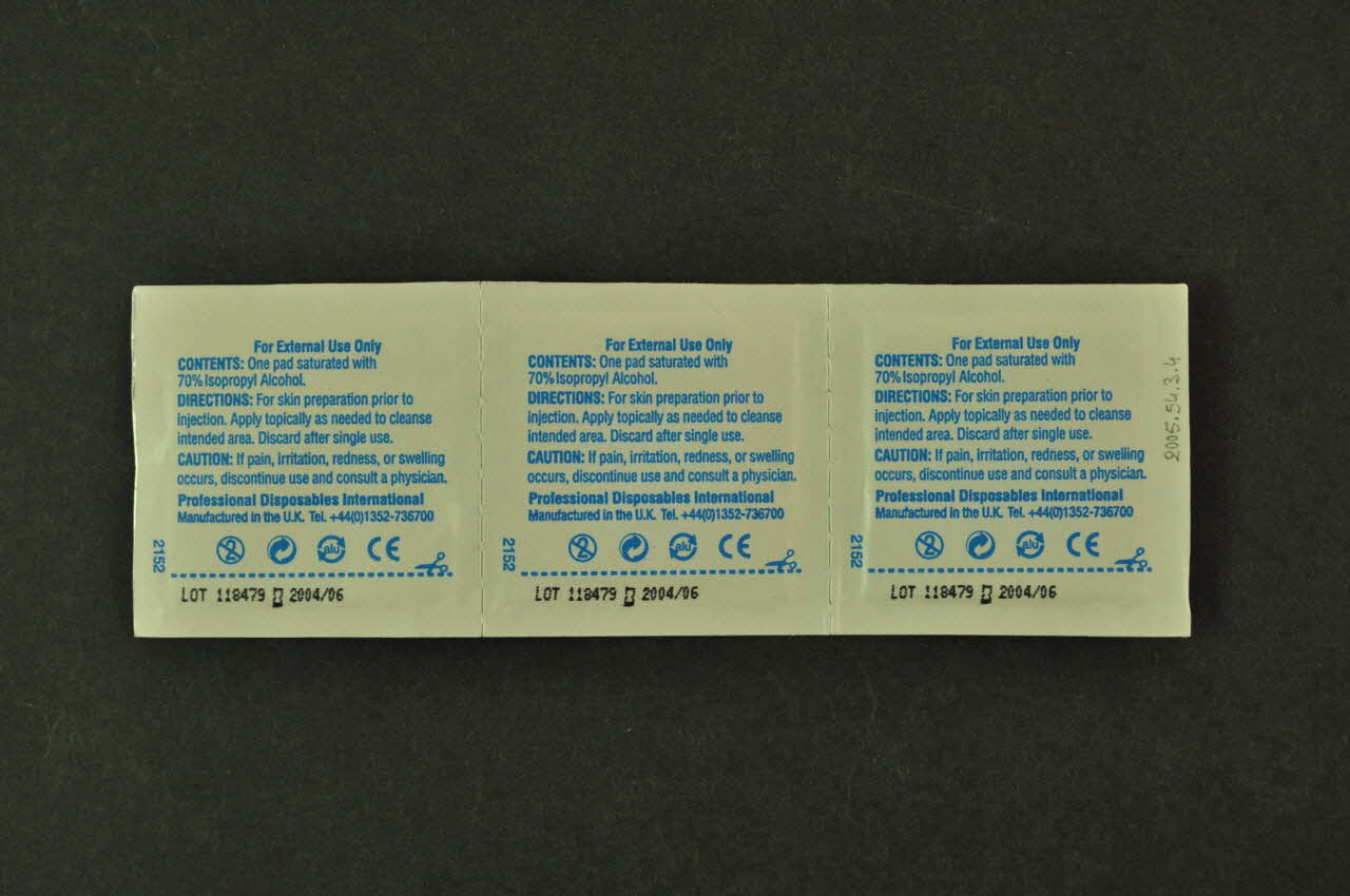 For External Use Only // // CONTENTS : One pad saturated with 70% Isopropyl Alcohol // // DIRECTIONS : For skin preparation prior to injection. Apply topically as needed to cleanse intended area. Discard after single use. // // CAUTION : If pain, irritation, redness, or swelling occurs, discontinue use and consult a physician. // [...] // // 2004/06, versoDécor