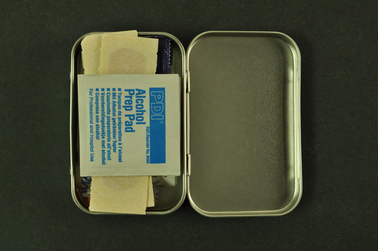 tampon, Kit de prévention, 3 doses d'alcool, bouchon, stericup, ascorbinezuur, préservatif, 5 sparadras dans boite en métal : 20 jaar spuitomruit