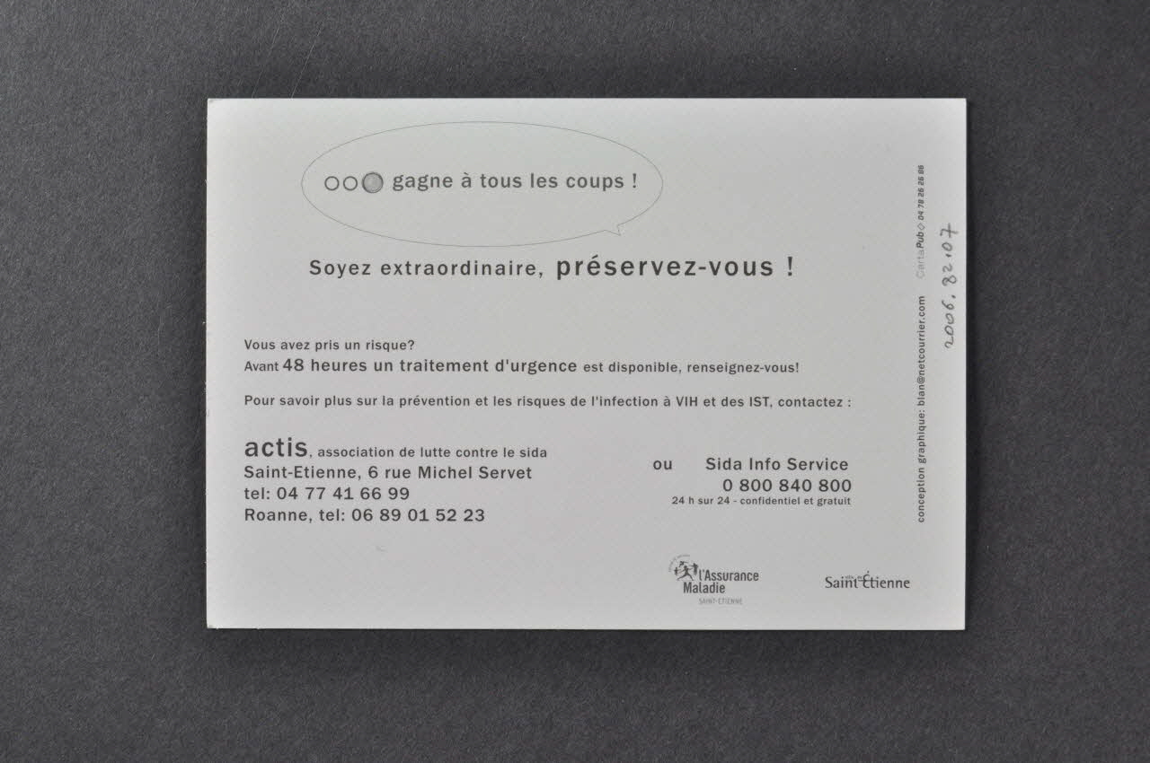000 gagne à tous les coups ! // Soyez extraordinaire, préservez-vous ! // // Vous avez pris un risque ? // Avant 48 heures un traitement d'urgence est disponible, renseignez-vous ! // // Pour savoir plus sur la prévention et les risques de l'infection à VIH et des IST, contactez : // // actis, association de lutte contre le sida // Saint-Etienne, 6 rue Michel Servet // [...] // Roanne // // Sida Info Service // 0 800 840 80024h sur 24 - confidentiel et gratuit, versoDécor