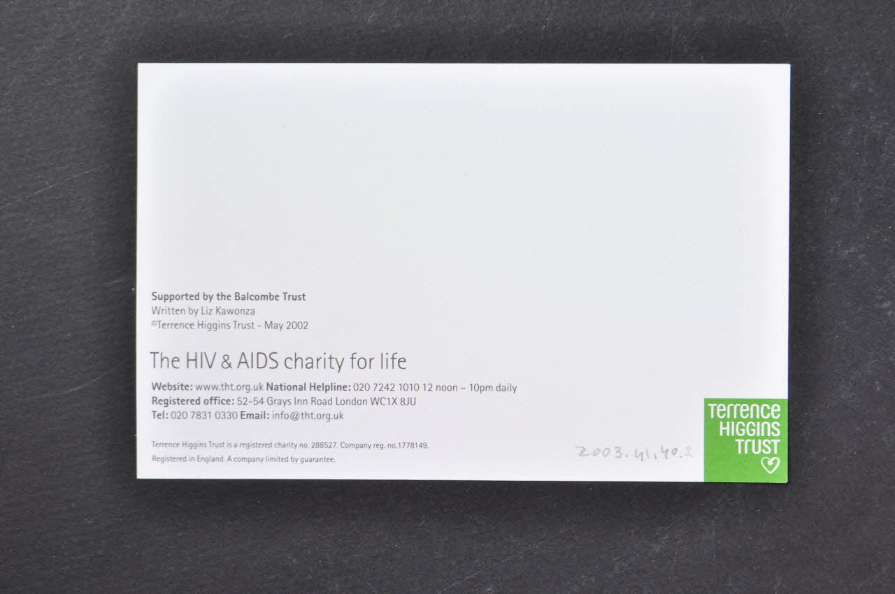 Supported by the Balcombe Trust / Written by Liz Kawonza / ©Terrence Higgins Trust - May 2002 (Inscription imprimée en noir, en petit, au dos de la carte, au dessus des coordonées de l'association. Elle donne le nom d'un partenaire, le nom de l'auteur, le copyright et la date pour l'ensemble du lot de carte 2000.41.41 à 2000.41.51.), versoLogo
