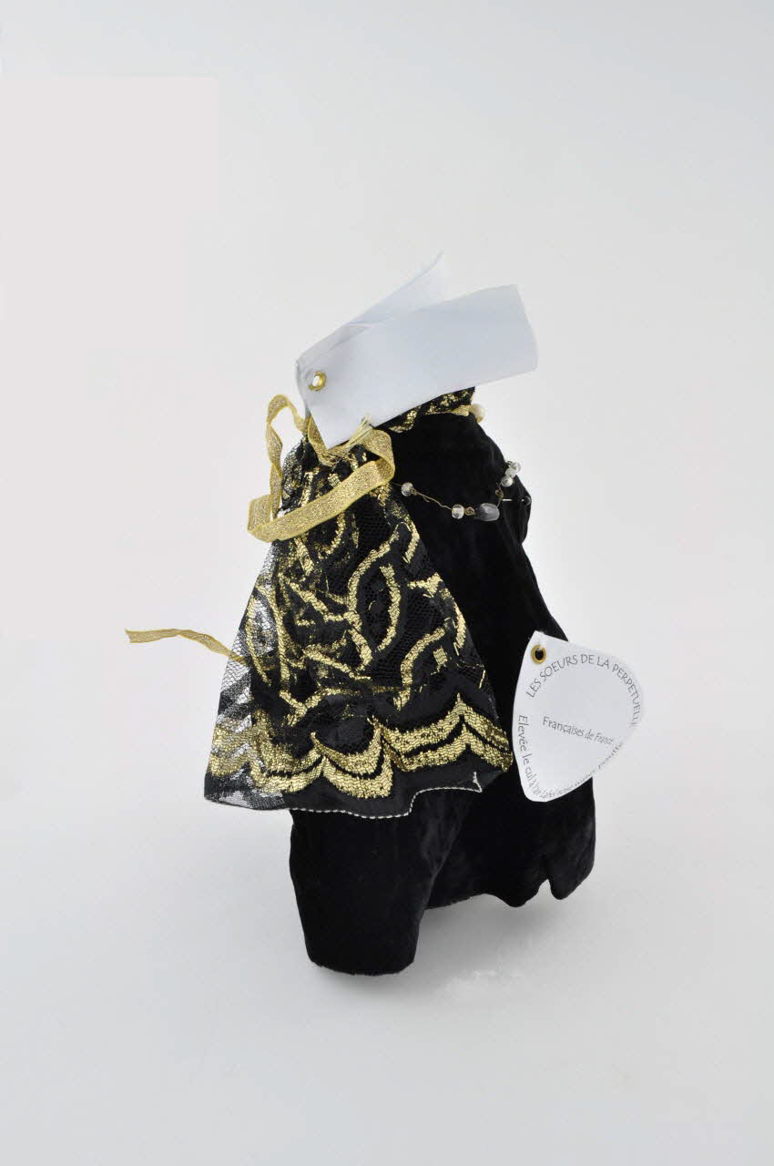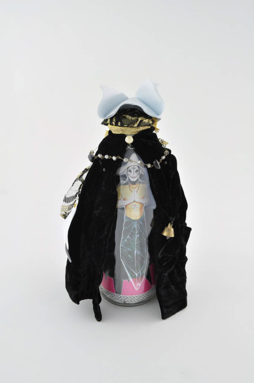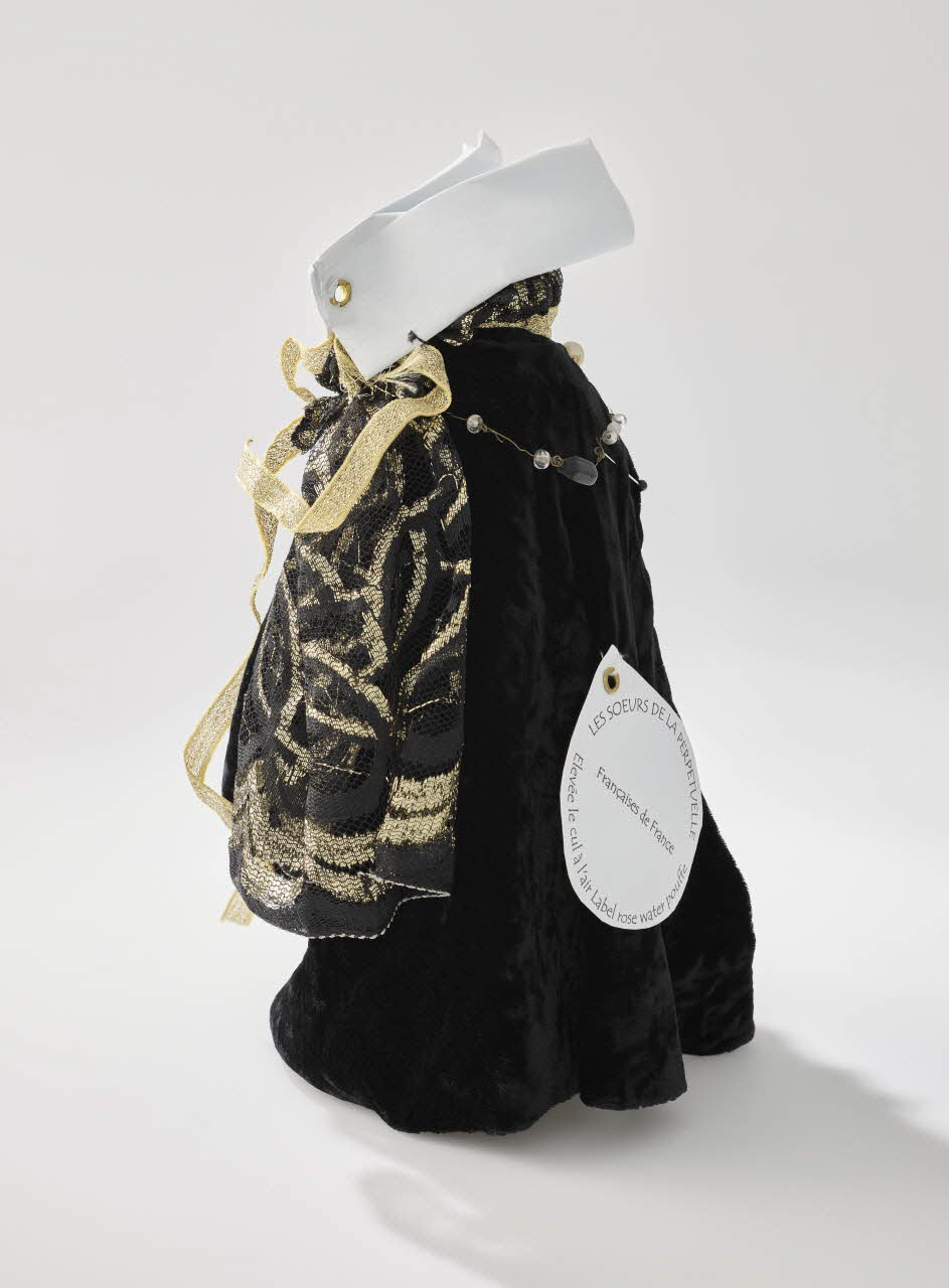 Flacon cylindrique en verre à l'intérieur duquel figure, imprimé sur une feuille blanche, le dessin couleur représentant la soeur torse nu, les mains jointes, le visage maquillé, une croix au cou. La bouteille est recouverte d'un tissu de velours noir, formant une cape autour de l'image de la soeur (qui a d'ailleurs aussi une cape noire). A gauche, à l'emplacement de la main, est cousue une petite clochette de métal doré. A droite, une étiquette blanche est cousue sur le tissu avec, en cercle des inscriptions. La cape est fermée par une perle blanche. Autour de la cape, est placé un collier en petites perles blanches et noires. Le couvercle du flacon est recouvert d'un tissu de tulle noir et doré qui descend jusqu'au bas du dos, tenu par un ruban doré qui fait le tour du couvercle du flacon. Au dessus du couvercle est posée une cornette en carton blanc.Décor