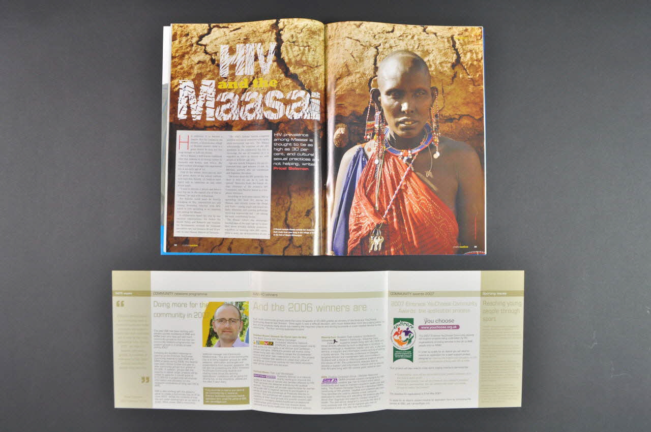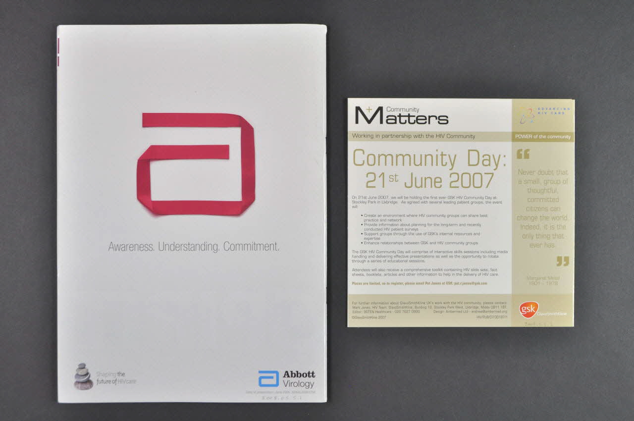 La couverture comprend une photographie noir et blanche pleine page représentant, un homme assis sur une chaise à une table de salle à manger et est vu de face. Une plante est présente au premier plan à droite. Le nom de la revue est imprimé dans le haut. Le titre de l'exemplaire est imprimé au centre et du texte présentant le contenu de la revue est présent dans le bas à gauche. En petit en bas se trouvent le numéro de la revue ainsi que la date. Enfin, dans l'angle inférieur droit, un logo est imprimé et comprend trois lettres à moitié placées sur un encadré rouge. Le dos comprend, au centre, un ruban rouge placé en rectangle et du texte en noir en dessous ; il s'agit de la forme d'un logo repris en petit dans l'angle inférieur droit (le logo de Abbott Virology). Un second logo est présent dans l'angle opposé. Le fond est gris. Un sommaire est imprimé en page trois et est divisé en trois parties. Une série de photographies illustrant différents articles est présente au centre et dans le bas à droite. Les pages sont imprimées, le plus souvent, en noir sur blanc. Les mises en pages varient beaucoup d'un article à l'autre. Certaines pages comprennent des encarts publicitaires, des photographies (en vignettes ou pleine page), des encadrés... Les pages sont numérotées et on retrouve dans le bas de chacune le nom de la revue. Un dépliant également en anglais est glissé à l'intérieur de la revue (2005.5.5.2). Celui-ci est constitué d'une longue feuille de papier glacé imprimée et pliée en trois volets. Il s'agit d'une numéro 10 de "Community Matters". Ce dernier comprend du texte imprimé en noir sur deux colonne et sur un fond gris clair. Des encadrés marron/vert sont présents ainsi que plusieurs logos. Sur la couverture, deux photographies couleur sont imprimées et représentent deux couples, l'un hétérosexuel, l'autre homosexuel.Inscriptions