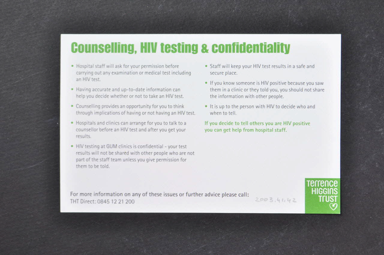 Counselling, HIV testing & confidentiality / [...] / If you decide to tell others you are HIV positive / you can get help from hospital staff. (Texte imprimé en noir sur le fond blanc du dos de la carte avec le titre et un paragraphe en vert. Seuls ces deux derniers sont retranscrits ici.), versoDécor