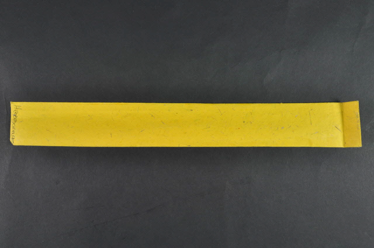 Etui en papier fort jaune dénommé "étui d’encens ». Sur l'étui, en rouge, figure le dessin d'une soeur brandissant un encensoir. L’étui, fermé par une agrafe, contient sept bâtons d'encens violets. Au dos, écrit à la main, « herbes orientales », mots individualisant l’étui.Inscriptions