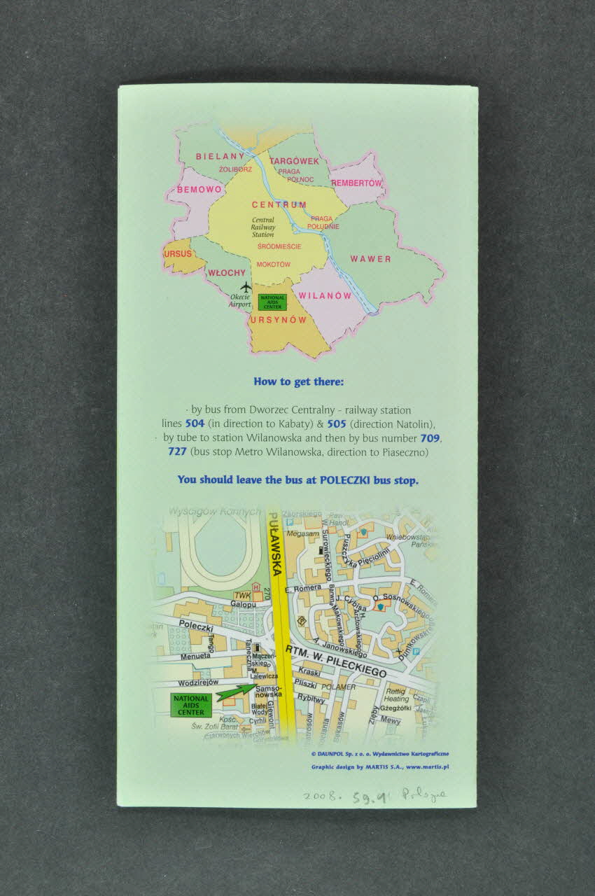 De forme rectangulaire, le dépliant en papier vert est plié en trois. Il se lit verticalement. Le tiers inférieur de la couverture est vert foncé. Au centre une photographie couleur représente un immeuble. En partie supérieure sont imprimés des logos et des inscriptions bleues. Le logo de droite est composé d'un ruban rouge dont une des pattes arbore les couleurs du drapeau polonais. En partie inférieure se trouvent des inscriptions blanches. Au dos, les inscriptions noires et bleues sont accompagnées de deux cartes. A l'intérieur, les inscriptions sont noires et bleues.Inscriptions