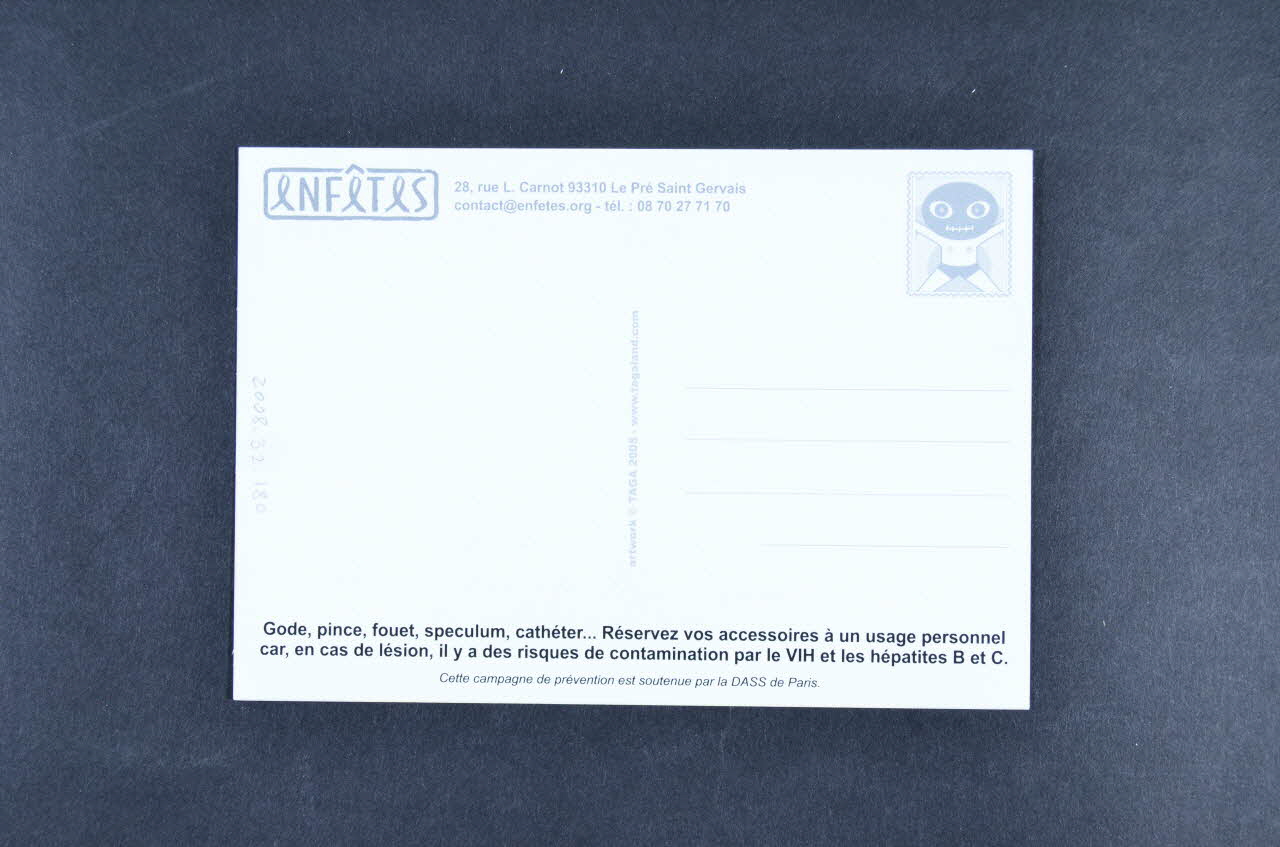 Au recto, un dessin représente un personnage aux tétons percés, vêtu d'un masque, d'un caleçon noir et de rangers. Il est attaché par les bras et les jambes à une cible rouge et jaune. En partie inférieure et en partie supérieure sont imprimées des inscriptions noires et blanches. Au verso, un logo gris et des inscriptions grises occupent la partie supérieure. En partie inférieure se trouvent des inscriptions noires. A droite des lignes grises permettent d'inscrire l'adresse et l'emplacement pour le timbre reprend un détail, en noir et blanc, du dessin du recto.Inscriptions