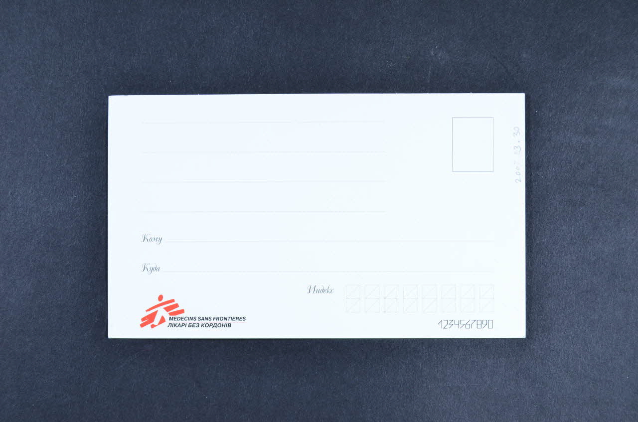 Le recto est en sens vertical. Il présente un fond rouge où figurenet trois mots en grandes capitales cyrilliques noires. Le "O" du premier mot a la forme d'un préservatif rose dans une enveloppe argentée. En dessous de l'inscription, une phrases blanche est inscrite. En bas, figure le logo de Médecins sans Frontières. Tout en bas, est présent un petit bandeau noir et avec des inscriptions en petits caractères rouges précédées d'un petit ruban rouge et en tout petits caractères blancs. Le verso est en sens horizontal. Il présente un fond blanc avec des emplacements pour le message et l'adresse. En bas, à gauche, figure le logo de Médecins sans Frontières.Décor