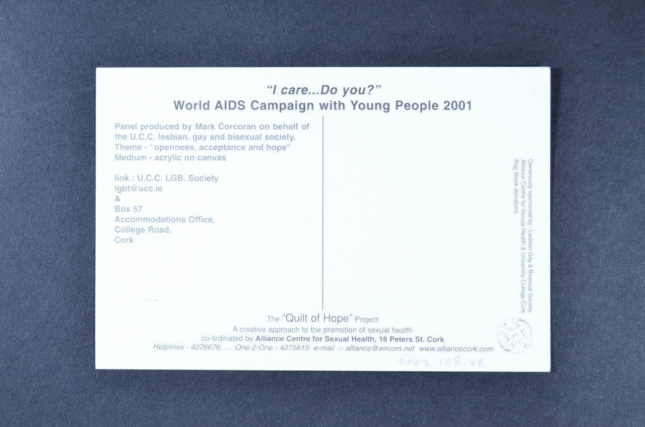Proverb :"peace on heaven & earth" (En lettres dorées en haut), recto"I care....Do you ?" // World AIDS Campaign with Young People 2001 (En haut en caractères noirs sur fond blanc), versoQUILT OF HOPE (En lettres dorées majuscules en bas), rectoTexte