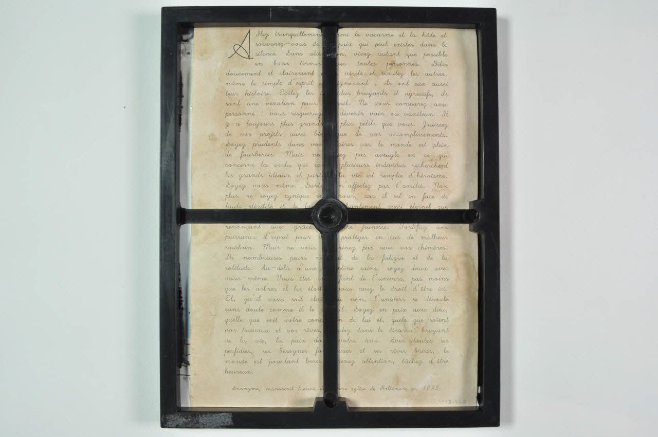 "Allez tranquillement parmi le vacarme et la hâte et souvenez-vous de la paix qui peut exister dans le silence. sans aliénation, vivez autant que possible en bons termes avec toutes personnes. Dites doucement et clairement votre vérité et écoutez les autres, même le simple d'esprit et l'ignorant : ils ont eux aussi leur histoire. Evitez les individus bruyants et agressifs, ils sont une vexation pour l'esprit. Ne vous comparez avec personne : vous risqueriez de devenir vain ou vaniteux. Il y a toujours plus grands ou plus petits que vous. Jouissez de vos projets aussi bien que de vos accomplissements. Soyez prudents dans vos affaires car le monde est plein de fourberies. mais ne soyez pas aveugle en ce qui concerne la vertu qui existe, plusieurs individus recherchent les grands idéaux et partout la vie est remplie d'héroïsme. Soyez vous-même. Surtout n'affectez pas l'amitié. Non plus ne soyez cynique en amour car il est en face de toute stérilité et de tout désenchantement aussi éternel que l'herbe. Prenez avec bonté le conseil des années en renonçant avec grâce à votre jeunesse Fortifiez une puissance d'esprit pour vous protéger en cas de malheur soudain. Mais ne vous chagrinez pas avec vos chimères. De nombreuses peurs naissent de la fatigue et de la solitude. Au delà d'une discipline saine, soyez doux avec vous-mêmes. Vous êtes un enfant de l'univers, pas moins que les arbres et les étoiles, vous avez le droit d'être ici. Et, qu'il vous soit clair ou non, l'univers se déroule sans doute comme il le devrait. Soyez en paix avec dieu, quelle que soit votre conception de lui et, quels que soient vos travaux et vos rêves, gardez dans le désarroi bruyant de la vie, la paix de votre âme. Avec toutes ses perfidies, ses besognes fastidieuses et ses rêves brisés, le monde est pourtant beau. prenez attention, tâchez d'être heureux.