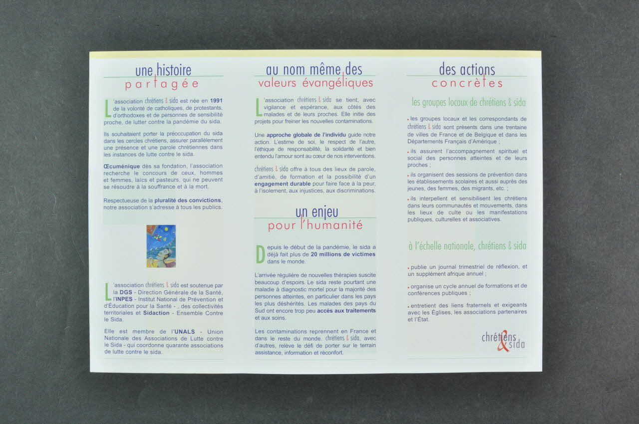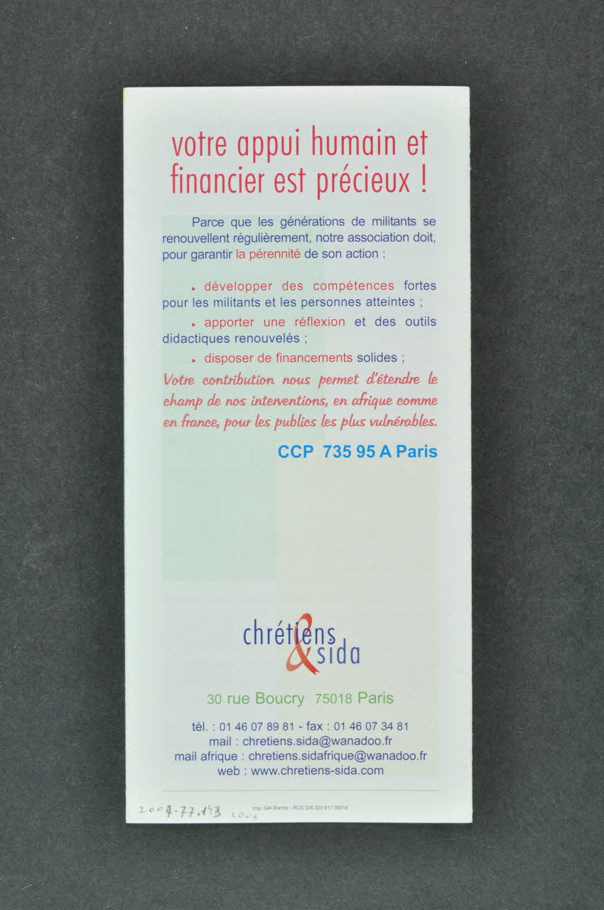 une histoire // partagée // // au nom même des // valeurs évangéliques // // un enjeu // pour l'humanité // // des actions // concrètes // les groupes locaux de chrétiens & sida // à l'échelle nationale, chrétiens & sida // // nos actions en afrique // // votre appui humain et // financier est précieux ! (titres), à l'intérieurTexte