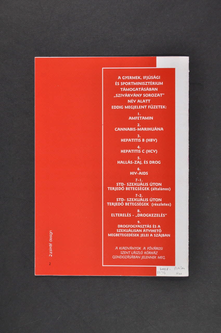 Au dos, les titres des autres numéros : 1. Amphétamine (2006.72.05) 2. Cannabis-Marijuana (2006.72.06) 3. Hepatitis B (HBV) (2006.72.07) 4. Hepatitis C (HCV) (2006.72.08) 5."Hallas -Zaj, ès drog" (Oreilles et drogues) (2006.72.09) 6. HIV/AIDS (2006.72.10) 7.1 IST (2006.72.11) 7.2 IST (2006.72.12) 8. Autres drogues ? (2006.72.13)