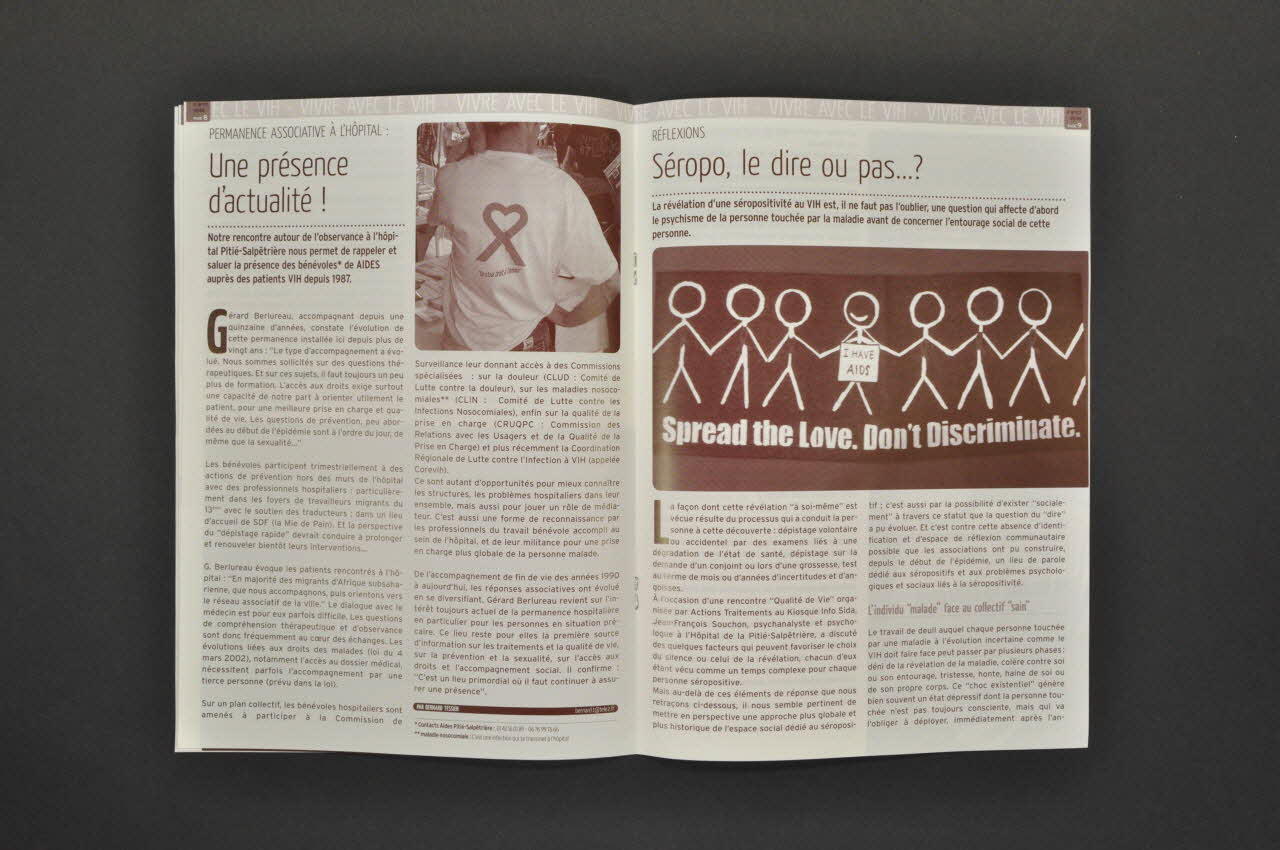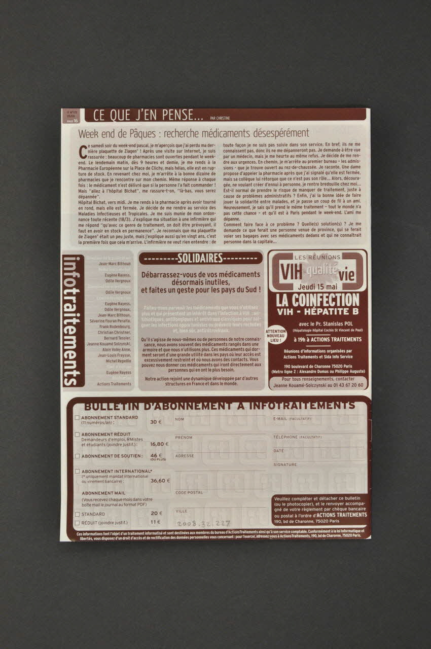 page 2. Quoi de neuf thérapeutique: Question d'actualité // page 5. Observance à l'hôpital: une démarche d'éducation thérapeutique // page 6. Le patient au centre de la consultation d'aide à l'observance // page 8. Permanence associative à l'hôpital : une présence d'actualité // page 9. Réflexions: Séropo, le dire ou pas // page 12. Accès précoce aux antirétroviraux: Le dilemme du rapport bénéfice/risque (Sur un bandeau marron, dans la partie inférieure), sur la couvertureAdresse