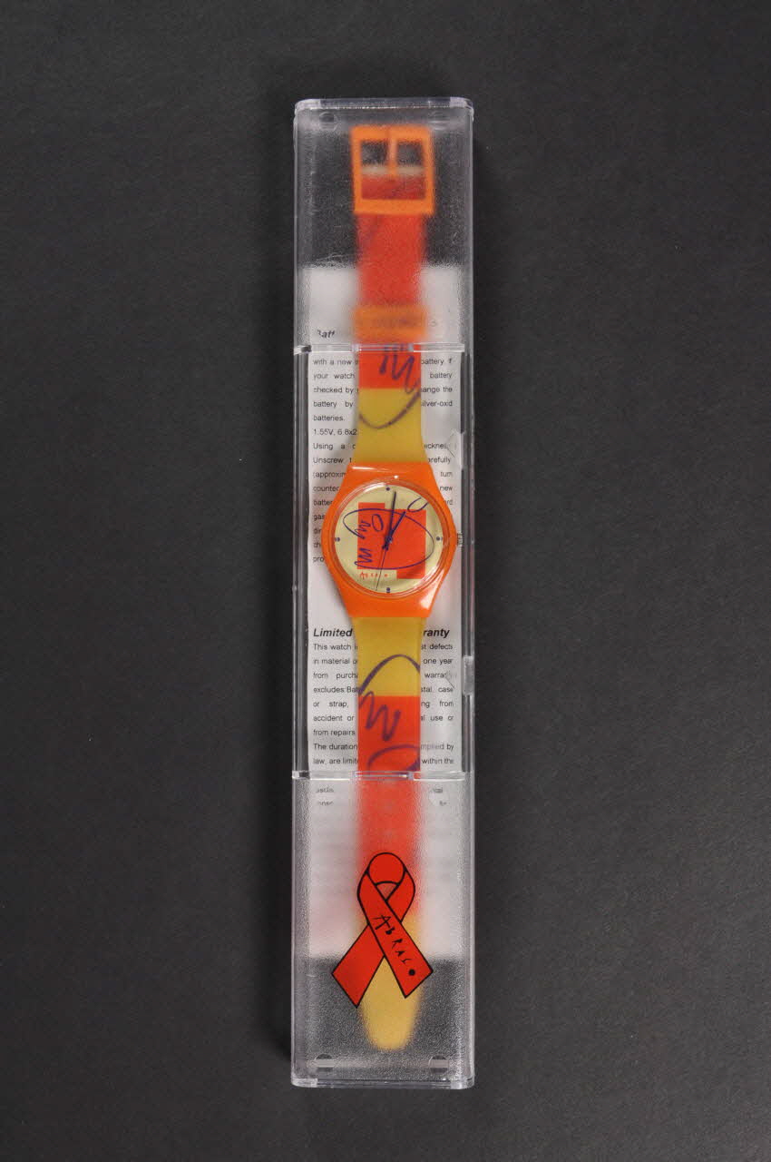 transparent. Un dessin bleu de bras est représenté sur l'autocollant à fond orange et jaune. La boucle est en plastique orange. Un anneau en plastique orange est enfilé sur le bracelet. Le nom de l'association est imprimé dessus en bleu. Une pile circulaire est enfoncée au revers du cadran.Décor