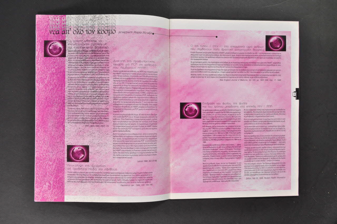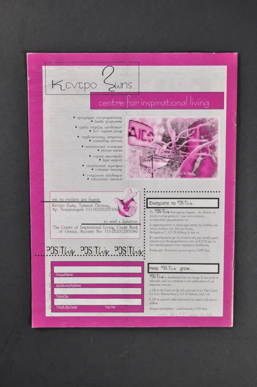 Revue publiée par l'association, entièrement en grec (traduire le sommaire) Couverture. Fond mauve. On entrevoit une image floue de femme derrière des barreaux. Bandeau vertical gris à gauche avec en capitales noires puis italiques roses :"Posit /hiv". En bandeau vertical rose, n°14, mars-avril-mai 1999, revue pour les personnes vivant avec le VIH/sida. Intérieur. certaines pages sont blanches, d'autres roses. Apparemment (vérifier) - nouvelles des traitements - nouvelles de l'association Apparemment, en 1997 (2006.75.06) la revue était bilingue grecque anglais et elle ne l'est plus en 1999.