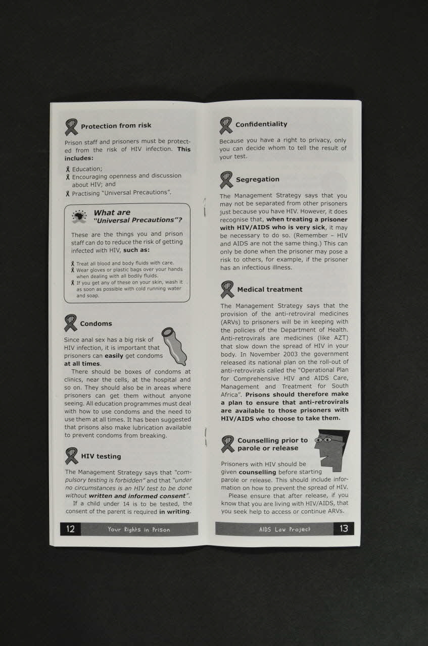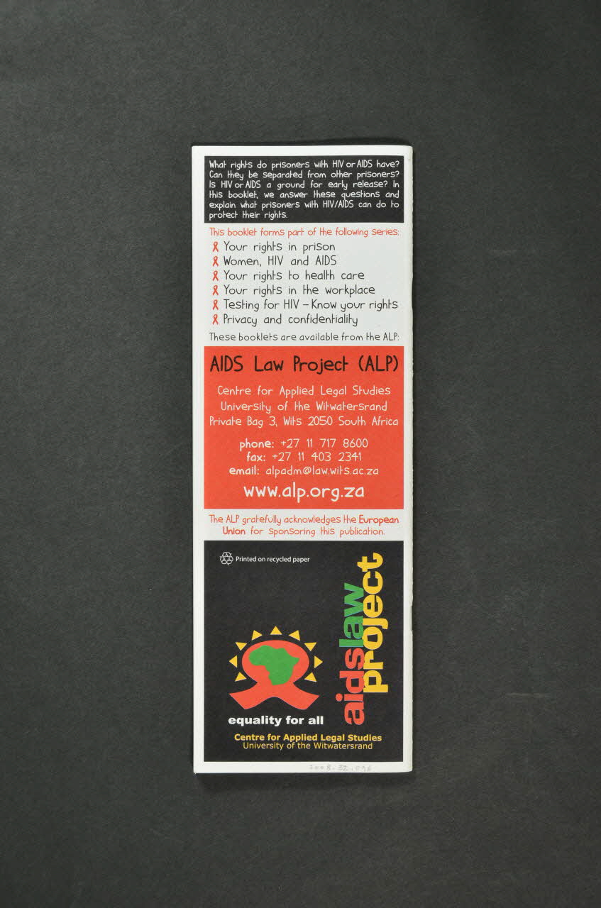 Dos. Fond blanc.En haut, rectangle noir avec en blanc, présentation de la brochure. En dessous, en rouge et noir sur fond blanc, les autres titres de la série. En dessous, carré rouge avec, en noir et blanc les coordonnées du Aids Law Project., avec le logo en bas dans un carré noir. Intérieur. Fond blanc, impression en noir, encadrés en noir sur fond gris, titres en blanc sur bandeau noir.. Sommaire - p.1 (Titre en blanc sur bandeau rouge avec un grand "?" en dessous en gris blanc et rouge, associé à un ruban rouge. Encadré en noir sur fond gris et en blanc sur fond rouge) : "Qu'est-ce que le VIH et le sida ?" - p.2 Les détenus et le VIH/sida - p.3 Que dit la loi sur les détenus vivant avec le VIH/sida et quels sont leurs droits - p.11 Que dit la police "management strategy on HIV/AIDS in Prison ? - p.14 Quels sont les droits des femmes détenues et de leurs enfants ? - p.16 Que faire après avoir été violé en prison ? - p.18 Le statut de séropositivité peut-il permettre d'être libéré plus tôt ? - p.19 Que faire si vos droits sont violés - p.21 Adresses utiles