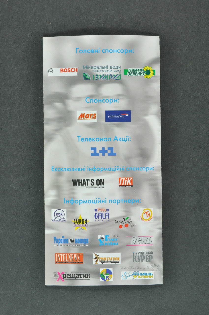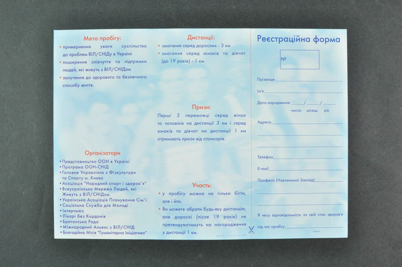 De forme rectangulaire, le dépliant en papier est plié en trois. Il se lit verticalement. Il est imprimé en Ukrainien, en alphabet cyrillique. Lorsque le dépliant est ouvert, il présente sur une face une photographie floue de coureurs dans les tons gris en guise de fond. De l'autre côté, la même photographie est dans les tons bleu clair. La couverture présente des inscriptions rouges, bleues, violettes et noires, un logo, un ruban rouge et un petit dessin représentant un coureur. Au dos figurent de nombreux logos. A l'intérieur, le texte est imprimé en rouge, bleu et noir. Le rabat peut se découper pour former un bulletin à remplir.