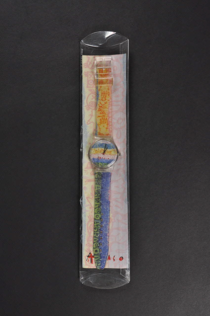 cadran est recouvert d'un autocollant à fond rose, bleu, jaune et vert avec des dessins de tags où figure le nom de l'association. Les aiguilles sont noires sauf la trotteuse qui est rouge. Pas de chiffre imprimés. Le bracelet est en plastique transparent. Un autocollant à fond rose, bleu , vert et jaune est parsemé de dessins de tags où figure le nom de l'association. La boucle est en plastique translucide. Un anneau en plastique jaune est enfilé sur le bracelet. Un disque métallique cache le revers du cadran.Décor