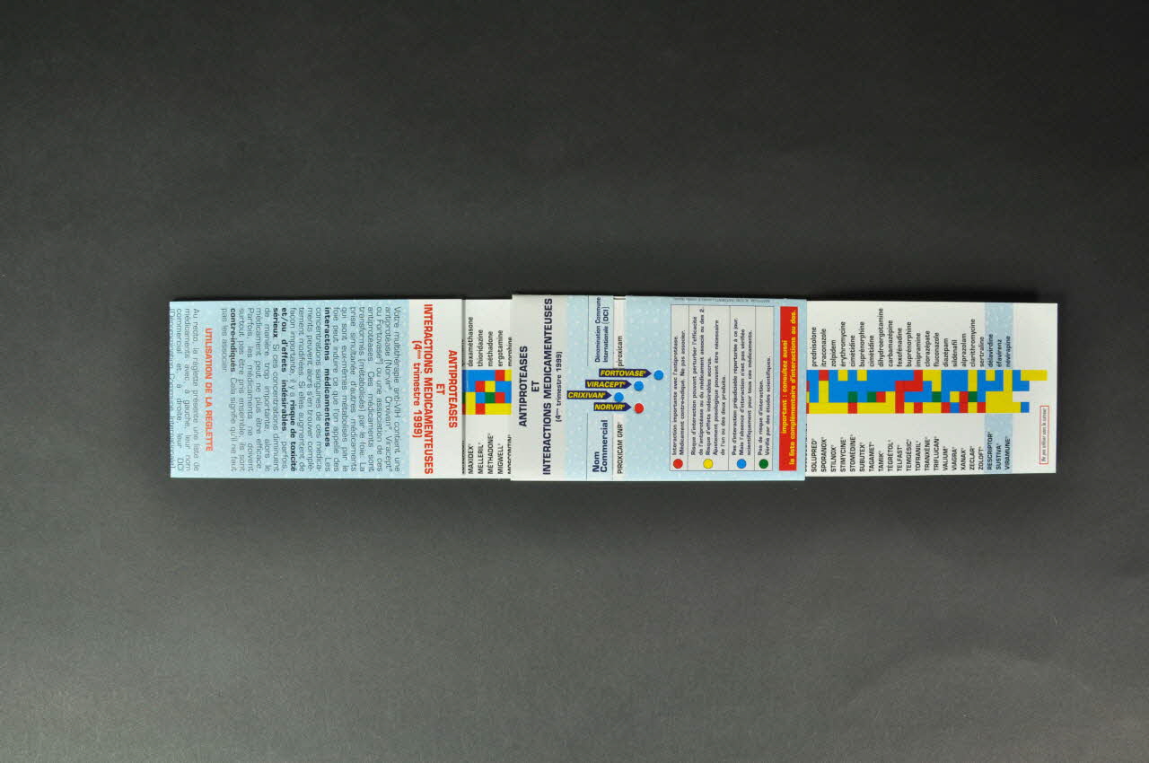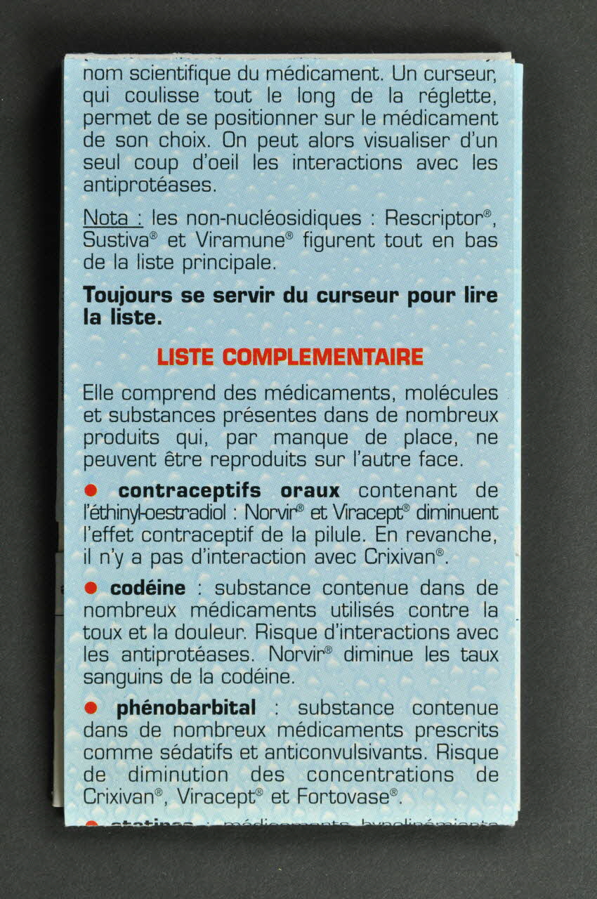 Réglette en carton blanc avec une partie coulissante. Inscription en haut, en bas et au dos. A gauche nom commercial du médicament; à droite Dénomination Commune Internationale Sur le curseur 4 trous correspondant à 4 colonnes : "Norvir", "Crixivan", "Viracept", Fortovase ». 4 couleurs au point de rencontre : Couleur rouge : "Interaction importante avec l'antiprotéase. médicament contre-indiqué. Ne pas associer"; Couleur jaune : "Risque d'interaction pouvant perturber l'efficacité de l'antiprotéase ou du médicament associé ou des deux. Risque d'effets indésirables accrus. Ajustement posologique pouvant être nécessaire de l'un ou des deux produits" Couleur bleu : "pas d'interaction préjudiciable répertoriée à ce jour. mais l'absence d'interaction n'est pas vérifiée scientifiquement pour tous ces médicamentsInscriptions
