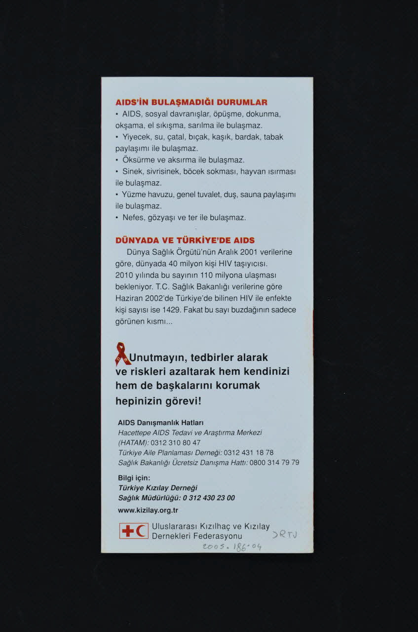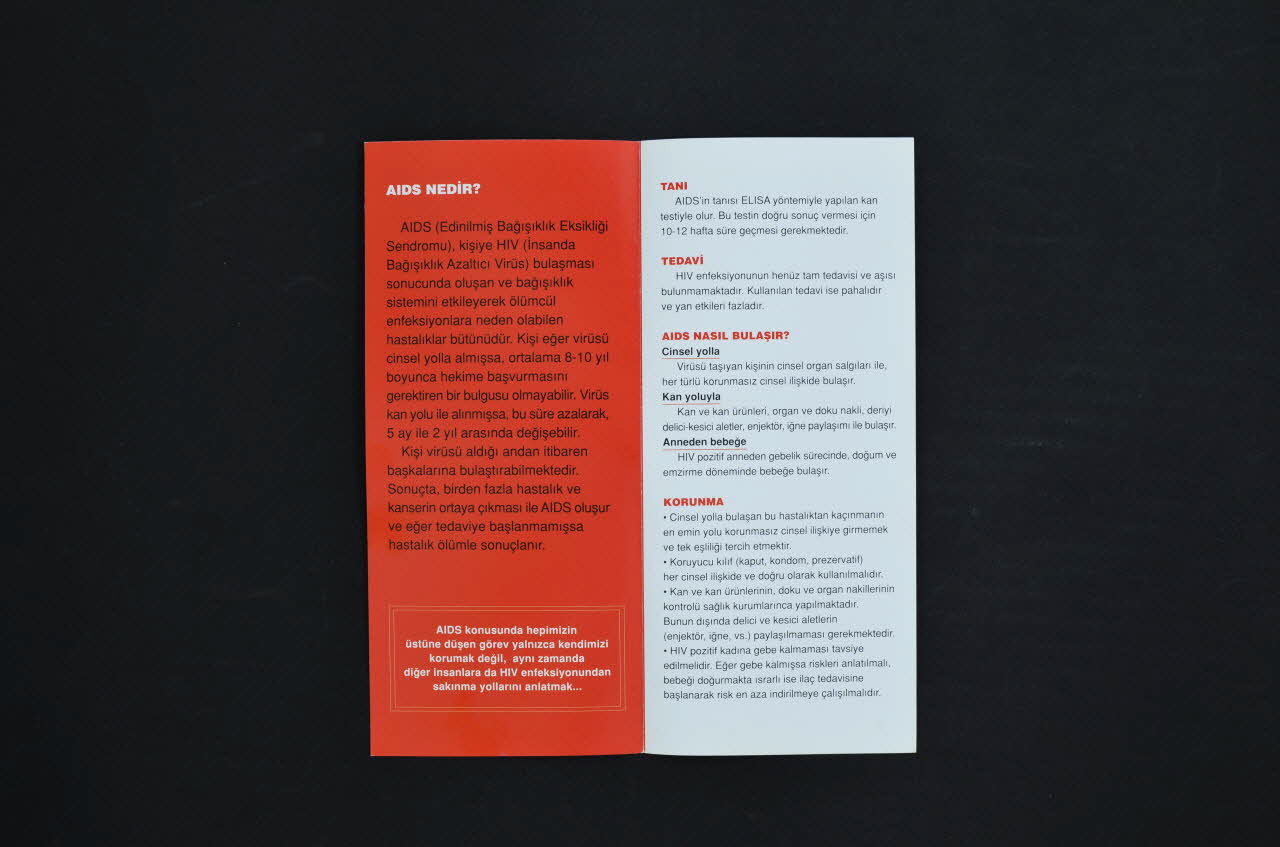 Feuillet intérieur 1. Fond rouge, impression en noir. Titre en blanc : AIDS Nedir?. En bas, encadré, en blanc : "AIDS konusunda hepimizin üstüne düsen görev yalnizca kendimizi korumak degil, ayni zamanda diger insaniara da HIV enfeksiyonundan sakinma yollarini anlatmak..." Feuillet 2. Fond blanc, impression en noir, sous titres en petites capitales rouges : Tani / Tedavi / AIDS Nasil Bulasir ? / Korunma Dos. Fond blanc, impression en noir, sous titres en petites capitales rouges : AIDS' in Bulasmadigi Durumlar. / Dünyada ve Türkiye'de AIDS. En bas, en caractères gras noirs, précédé d'un petit ruban rouge : "Unutmayin, tedbirler alarak ve riskleri azaltarak hem kendinizi hem de baskalarini korumak hepimizin görevi !"
