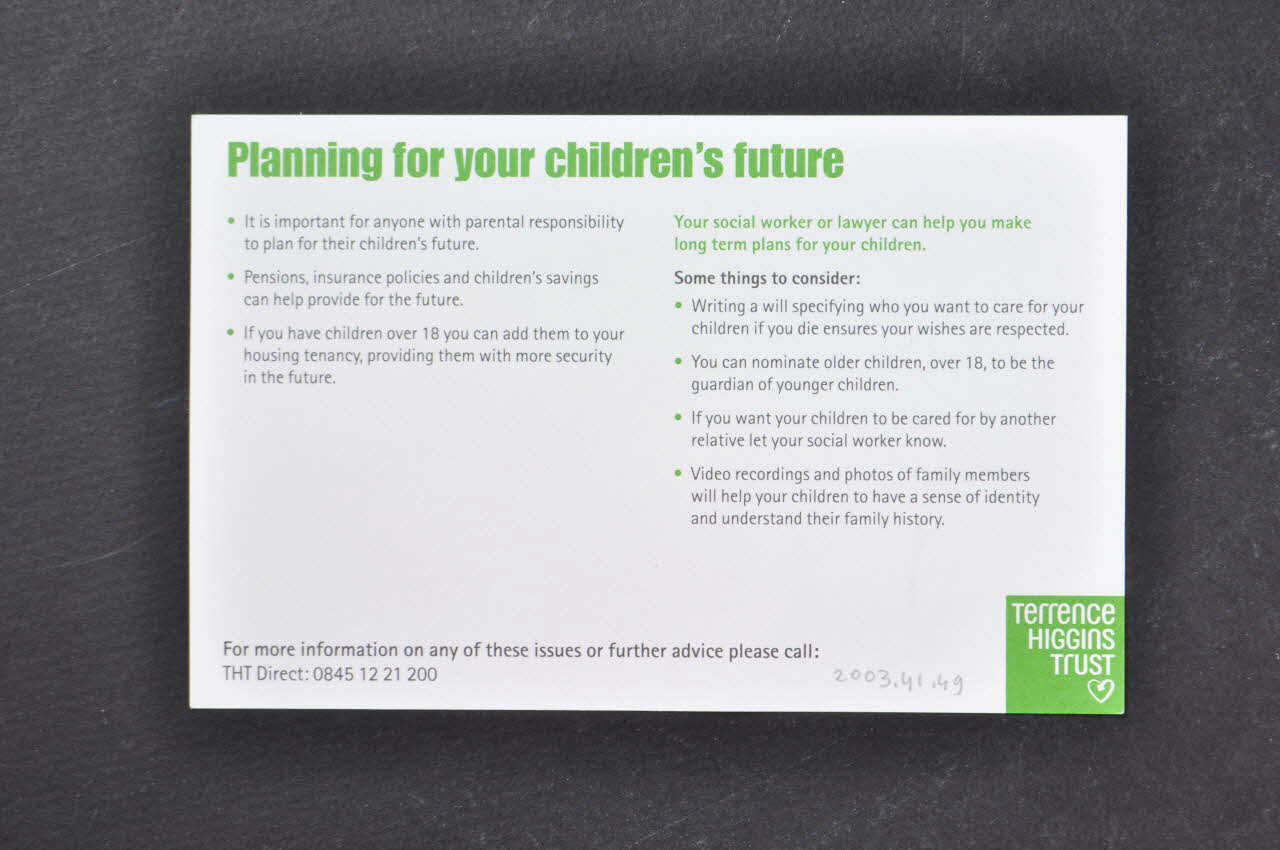 TERRENCE / HIGGINS / TRUST (Ce logo est imprimé en bas, à droite, sur le dos de la carte, en blanc sur un carré vert.), versoTexte