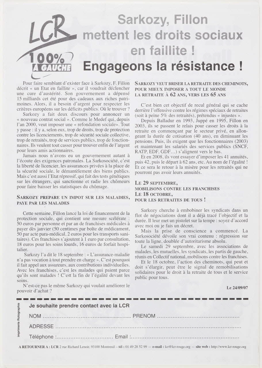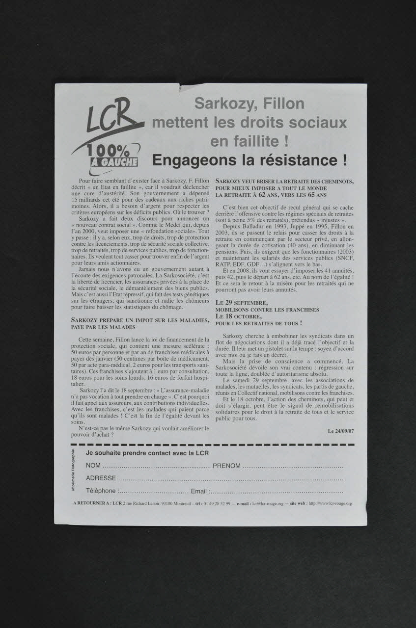 tract, "Sarkozy, Fillon mettent les droits sociaux en faillite Engageons la résistance !"