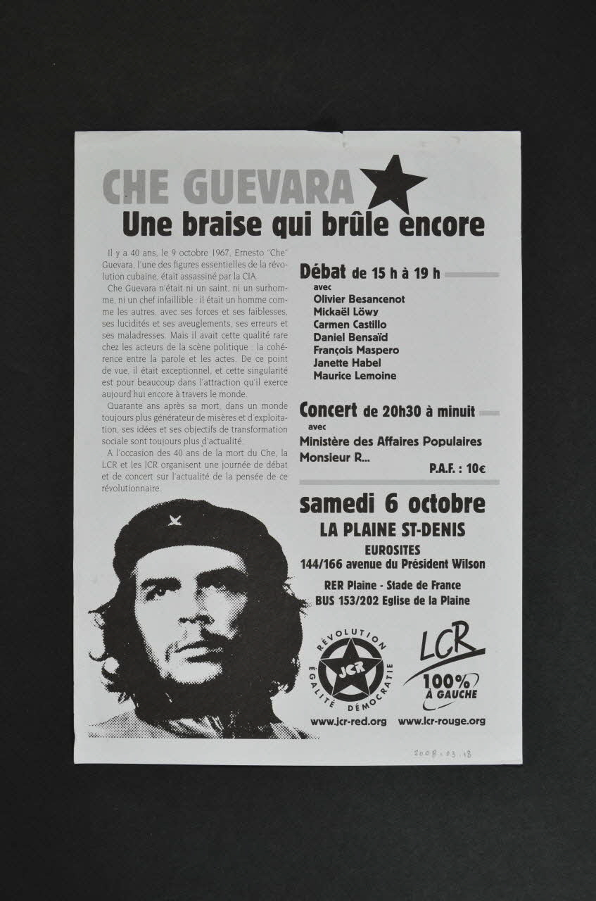 Le recto présente un titre en gris et noir, situé en partie supérieure. A gauche du titre, figure un logo. En dessous, est imprimé un texte sur deux colonnes avec trois parties en gras.La partie inférieure est constituée de pointillés avec, en dessous, un texte à trous constituant un bulletin d'adhésion. Le verso présente un slogan en gris et noir avec, au dessous, un texte sur la partie gauche et un programme sur la partie droite. La partie inférieure gauche présente une photographie de Che Gevara. Deux logos figurent sur sa droite.Inscriptions