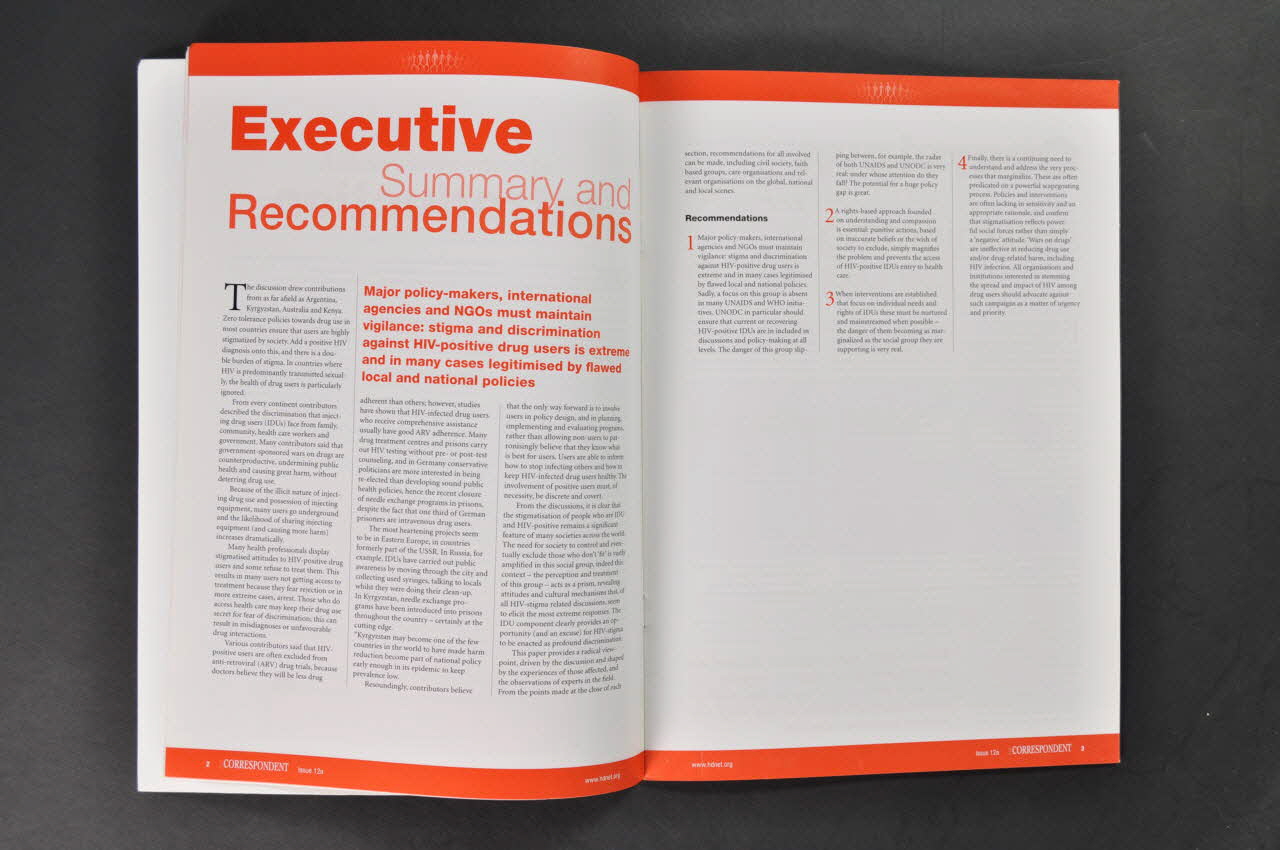 Acknowledgments ... iv // Introduction ... 1 // Executive Summary and Recommendations ... 2 // Overview : Stigma, HIV/AIDS Infecting Drug Use ... 4 // Moderator Questions ... 5 // Themes ... 5 // // 1 SETTING THE SCENE : THE PREVALENCE OF STIGMA ...6 // [...] // // 2 RESPONSES IN SOCIETY ... 10 // 5...] // // 3 IMPACT ON USERS ... 13 // [...] // // 4 MEANINGFUL INTERVENTIONS ... 15 // [...] // // 5 CONCLUSION ... 19 (3ème page, non paginée), à l'intérieurNuméro