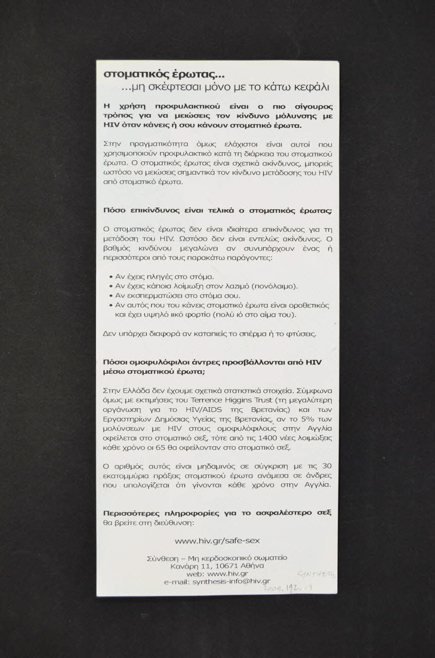 Ce flyer grec de format rectangulaire est de couleur mauve.