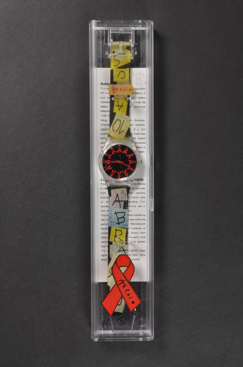 Montre bracelet en plastique et métal. Le boîtier est en plastique transparent. Le cadran est recouvert d'un autocollant à fond noir avec de nombreux rubans rouges imprimés. Les aiguilles sont rouges. Pas de chiffre imprimés. Le bracelet est en plastique transparent. Un autocollant à fond noir est parsemé de rectangles de couleurs jaune, verte, bleu, gris avec chacun une lettre formant un slogan ou le nom de l'association. La