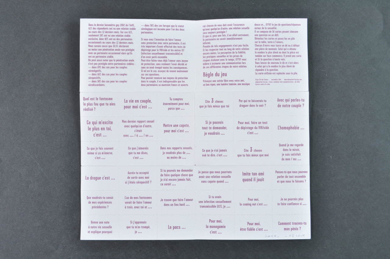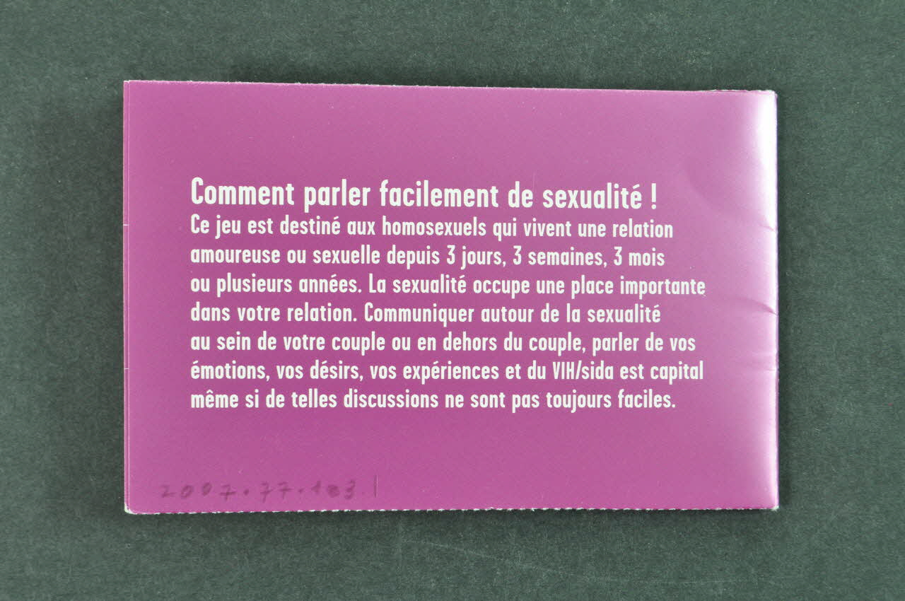 "Comment parler facilement de sexualité !" Présentation du jeu : "... Communiquer autour de la sexualité au sein de votre couple ou en dehors du couple, parler de vos émotions, vos désirs, vos expériences et du VIH/sida est capital même si de telles discussions ne sont pas toujours faciles". / - Données épidémiologiques sur les relations stables non exclusives, sur les pénétrations anales non protégées, chez les homosexuels. - Pour faire l'amour sans protéction avec partenaire stable, importance d'avoir fait le test de dépistage et d'en parler ensemble, et de s'assurer mutuellement qu'avec quelqu'un d'autre une relation sexuelle sera toujours protégée. Règle du jeu. Avec le partenaire. poser les cartes à l'envers sur la table, lancer le dé, celui qui a le chiffre le plus élevé retourne la carte et lit la question. L'autre répond. de nouveau celui qui a le chiffre le plus élevé lit la question.