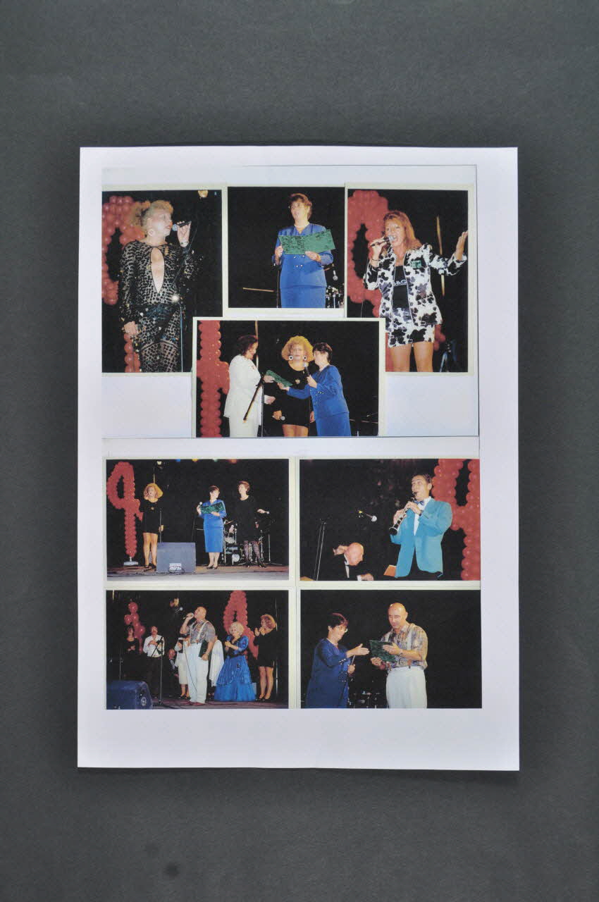 Il y a une copie couleur d'une invitation à une fête (.1), cette invitation a un fond rose, on peut y lire des inscriptions en noir sur douze lignes (nom de la fête, nom de l'organisateur, date...). Le dos de l'invitation a un fond vert. Il y a une impression au centre, en caractères dorés avec la date. En dessous, on peut voir le ruban rouge dont un pan est jaune, vert, bleu, brun. Sur .2, on peut voir huit photographies prises lors de cette cérémonie : des femmes chantent, des personnes remettent et recoivent des prix...Inscriptions