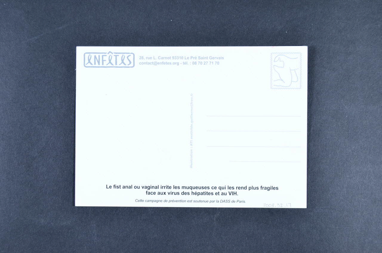 Le recto présente sur fond rose un poing fermé portant un gant en latex avec sur le poignet un dessin réprésentant un poing, pouce levé, entrant dans l'anus. Un slogan en lettres jaunes est inscrit en jaune dans la partie supérieure. Autour du poing, il y a trois phrases en marron. Le logo noir et blanc de l'association Enfêtes est dans l'angle inférieur droit. Le verso présente sur fond blanc un espace pour la correspondance et des inscription en noir. Le logo et les coordonnées de l'association sont dans l'angle supérieur gauche.Inscriptions