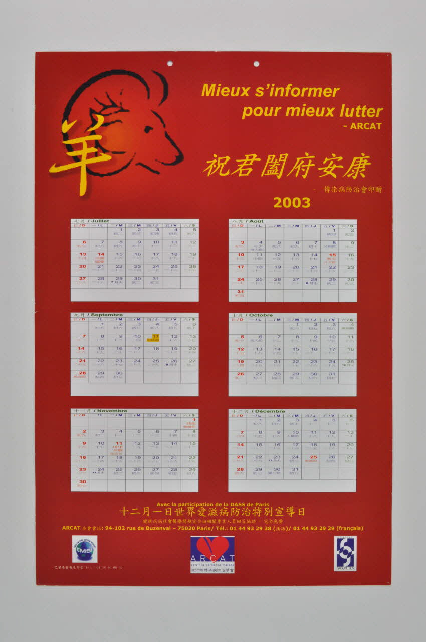 De forme rectangulaire, le calendrier affiche se lit verticalement. Il est imprimé en Français et en Chinois. Il est percée en centre en haut de deux trous pour pouvoir être accroché au mur.