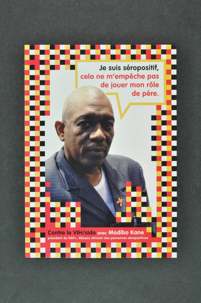 réalisé par le CRIPS- Ile de France, en partenariat avec Afrique avenir et African Positive Association et avec le soutien de Inpes, Sidaction, la DGS, la DRASSIF et les DASS Paris, Essonne, Seine Saint Denis, Val de Marne, Programme ZAC Prévention sida auprès des Africains en France. (En partie inférieure), versoJe suis séropositif, // cela ne m'empêche pas // de jouer mon rôle // de père. (Dans le phylactère), rectoDécor