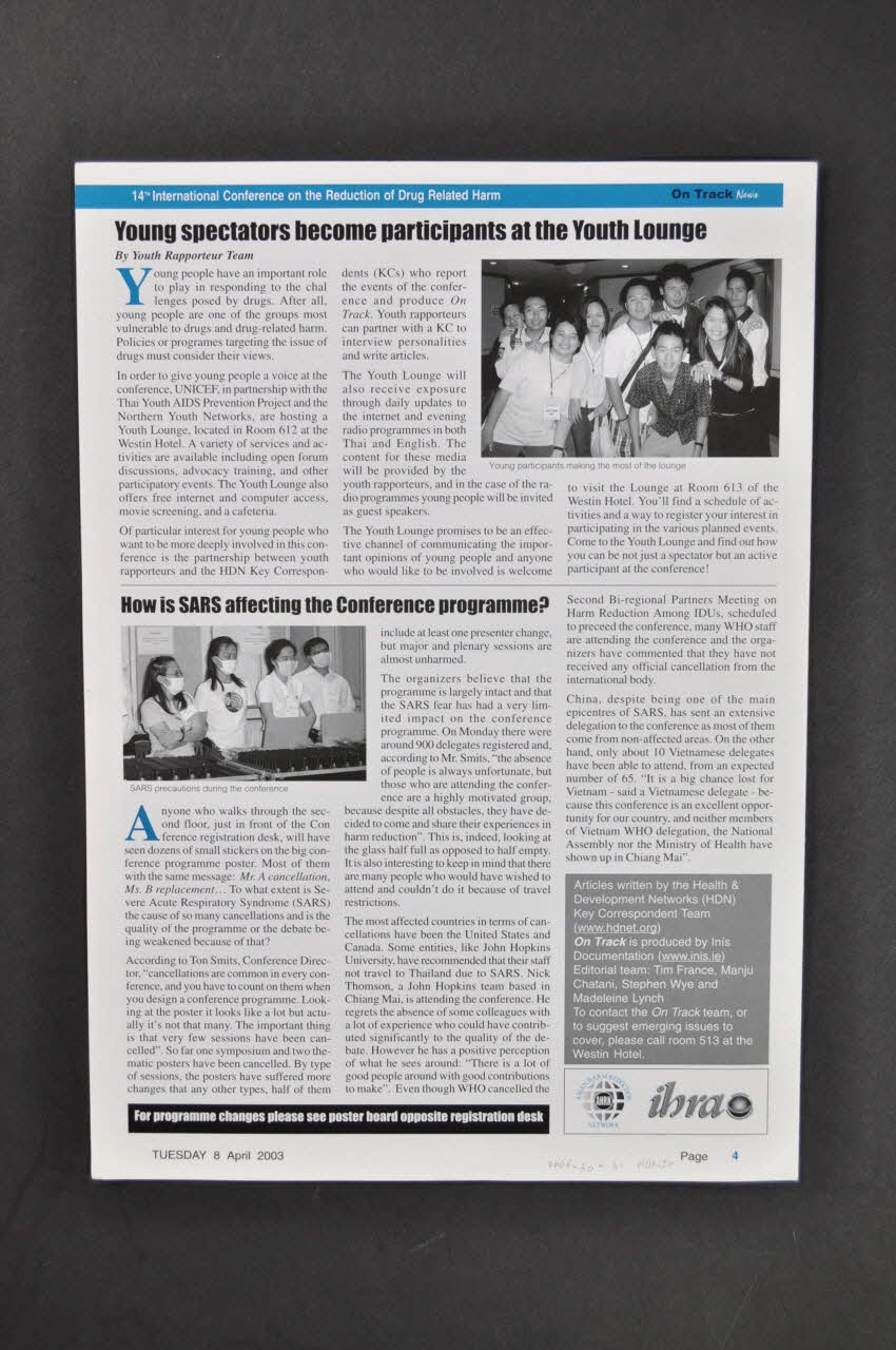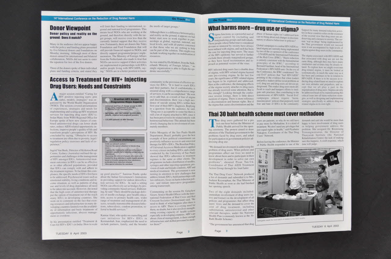 Bulletin associatif, "On track", 14 th international conference on drug related harm, 8/4/03, n° 2 : "Asian drug policy ... Community voices still not seen as relevant" (Police des drogues en Asie.. Les voix de la communauté ne sont toujours pas écoutées)