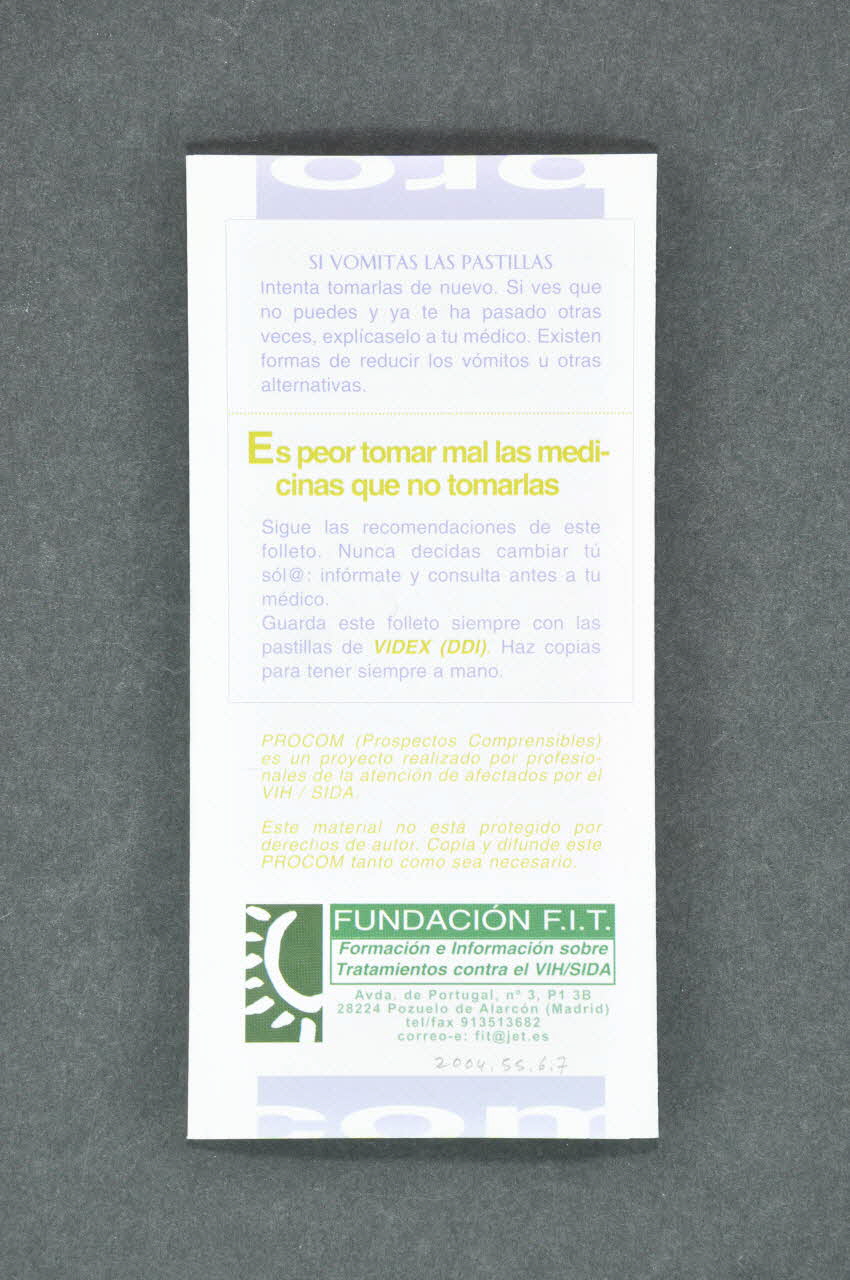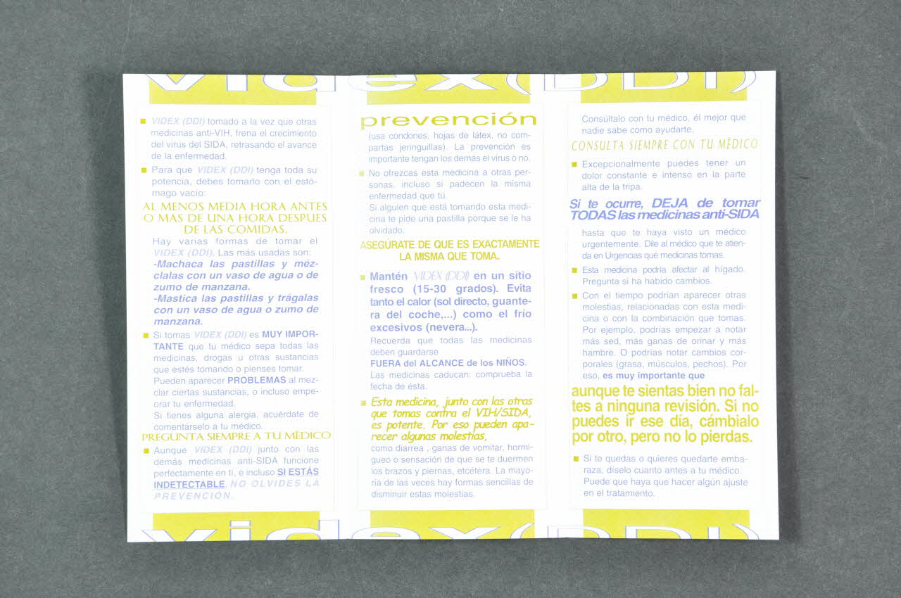 PREGUNTA SIEMPRE A TU MEDICO // // no olvides la // prevención // // Mantén VIDEX (DDI) // en un sitio fresco (15-30 // grados). Evita tanto el calor // (sol directo, guantera del // coche,...) como el frio exce- // sivos (nevera,...) // // FUERA del ALCANCE de los NIÑOS. // // Esta medicina, junto con las otras // que tomas contra el VIH/SIDA, // es potente. Por eso pueden apa- // recer algunas molestias, // // CONSULTA SIEMPRE CON TU MEDICO // // aunque te sientas bien no faltes a nin- // guna revisión. Si no puedes ir ese dia, // cambialo por otro, pero no lo pierdas. // // SI TE OLVIDA LA TOMA // // SI INTERRUMPES EL TRATAMIENTO // ANTI-SIDA // // SI VOMITAS LAS PASTILLAS // // Es peor tomar mal las medi- // cinas que no tomarlas (Au recto et au verso.)Décor
