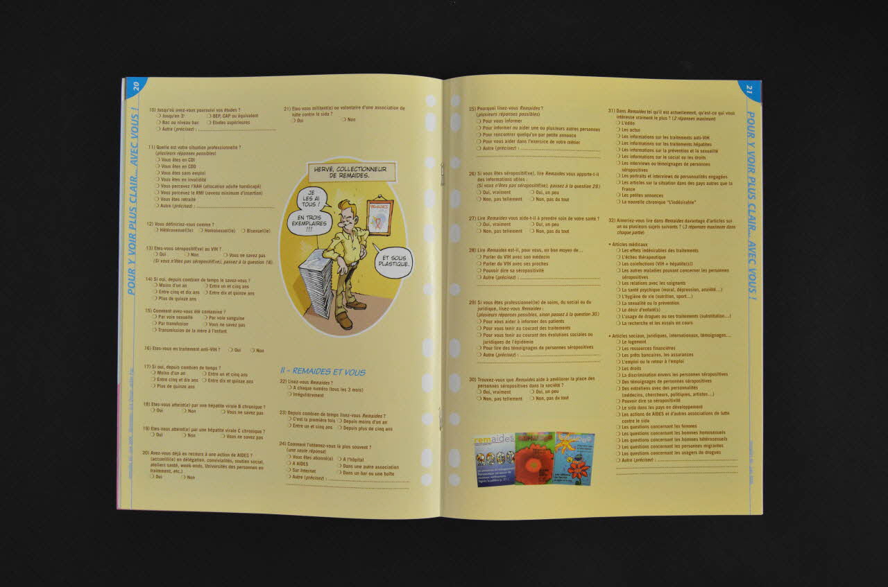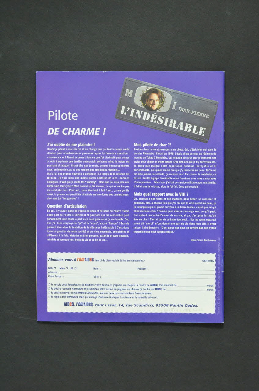 Collecté aux Solidays 2006 / Couverture. Fond rouge. Ton sur ton dessin d'une tête,légendé en petits caractères bleus sur le côté : "Une des dernières oeuvres de Gersende". En haut, en bleu (rem et "e") et en rouge (aids), le titre de la revue. En dessous, en petits caractères bleus : " n°60 - juin 2006". En dessous en blanc : "100 % et protocole de soins : Guidez votre médecin". A droite, petit losange bleu, en biais avec en blanc : "Questionnaire : votre revue est-elle un bon 'Remaides'?". En bas, en bleu : "VIH privé / VIH public. Mieux vaut-il être prudent ou militant ? Enquête : peut-on le dire à son enfant ?" Dos. Fond violet. Impression en blanc sur deux colonnes : témoignage de M Jean-Pierre L"indésirable Merci à tous ceux qui m'ont soutenu.... En bas, rectangle blanc avec en bleu, bulletin d'abonnement. Intérieur. Fond blanc, impression en noir sur 2 à 3 colonnes. Nombreux encarts et illustrations de couleur. 8 rubriques dont les articles ne sont pas à la suite les uns des autres mais dispersés dans le corps de la revue. Elles se distinguent par des couleurs différentes en première colonne de l'article : Actu : bleu / Se soigner : vert / Témoigner : violet / Vis ton VIH : blanc / Pour y voir plus clair avec vous : bleu / Serie : rose / Vos droits : brun / Et là-bas ? : bleu / Agir ! : brun. - p.2 . Fond gris-bleu, impression en noir sur deux colonnes, photo couleur de "Gersende". Titre en rose en violet : "Gersende a rejoint les étoiles". En bas, "ours" en bas sur bandeau rose. - p.3 A gauche, sommaire en rose et violet sur fond gris bleu. A droite, en violet sur fond blanc : Editorial par Christian Saout (petite photo). Titre en rose : "Parole d'(im) patients." - p.4-7 Rubrique Actu signalée en bleu sur les marges des pages. - p.4-5 (titre en bleu) "Quoi de neuf, Doc ?"; Impression en deux colonnes, en noir sur fond blanc, petits dessins couleur illustratifs, sous titres en couleur : "Reins et ténofovir" (bleu) / "Certains médicaments dé-remboursés !" (violet) / "L'antiprotéase TMC 114 de plus en plus accessible" (bleu) / "Meltrex, nouveau Kaletra" (brun) / "Médecines douces : un guide pour mieux les connaître" (vert) / "Les actes des Etats généraux migrants" (brun) / "Loi sur l'immigration, précarité pour les personnes touchées !" (orange) / "Jeunes SéroPotes, association qui dépote !" (bleu) / "La BD sexe à lire sur la plage!" (violet) / "Avis de recherche" (rose) - p.6-7 (titre en orange, sous titres en bleu, chapeau en orange, dessin coloré de Gersende) "Journée TRT-5 / Lumière sur la prise en charge tardive du VIH" : "Si le nombre de cas de sida en France baisse grâce à l'amélioration des traitements et de la prise en charge, celui des personnes découvrant leur séropositivité très tard, à l'occasion d'une maladie opportuniste (pneumocystose, toxoplasmose, cancer/lymphome, tuberculose, etc.) ne baisse pas. C'était le thème de la journée du TRT5, collectif inter-associatif, qui avait lieu le 24 mars dernier au Ministère de la Santé." - p.8-11, 13-17 Rubrique Se soigner signalée en vert sur les marges des pages. - p.8 (titre en brun, sous titre en vert, titres de paragraphes et chapeau en brun, encadré en vert, dessin coloré ). "Protéger ses mitochondries / Antioxydants et urindine, l'anti-rouille du corps ?" : "Les mitochondries sont les petites centrales énergétiques de nos celules. Elles s'abîment peu à peu avec le temps, mais surtout, sous l'effet du VIH et de certains médicaments, notamment Zérit(D4T), l'AZT (Rétrovir), Combivir, Trezivir, Videx (DDI). Pour protéger les mitochondries, les antioxydants et l'uridine sont à l'étude." - p.9 (titre et chapeau en bleu, sous titres en vert, dessin coloré de Gersende) "En voyage / pas de vacances pour le traitement " : "Vous partez vers la grande bleue, vous mettre au vert ou crapahuter dans un pays lointain... Mais comment concilier sac à dos et vie avec son traitement ? En s'y préparant, o l'avance !" - p.10-11 (titre et chapeau en bleu, sous titre en vert, titres de paragraphes en bleu dessin coloré humoristique et schéma). "L'orage immunitaire. / Un réveil en fanfare" : Les personnes commençant un traitement anti-VIH avec un nombre de T4 bas s'attendent à les voir augmenter et à ce que leur système de défense contre les microbes s'améliore. Pourtant, des problèmes de santé peuvent parfois survenir dans les semaines ou les mois qui suivent le début du traitement... C'est ce que l'on appelle le Syndrome de Reconstitution Immunitaire (SRI) ou "orage immunitaire" - p.13-15 (titre et chapeau en rouge, sous titre et titres de paragraphes en vert, dessin coloré humoristique. Encart en blanc sur fond vert ). "Troubles de la répartition des graisses. / Que sait-on ? Comment lutter ?" / "Beaucoup de personnes séropositives se plaignent de voir leur corps se modifier avec le temps. C'est ce que l'on appelle les troubles de la répartition des graisses (lipodystrophies). ils peuvent être de deux ordres : une perte de graisse au niveau des seins, de la nuque, de l'abdomen, et des organes internes (viscères)" / Encadré :"L'activité physique : un remède naturel" - p.16-17 (titre et chapeau en violet, sous titres et encart en vert, dessin coloré humoristique ). "Hépatite C / Où en est-on ?" / "Du 26 au 30 avril, s'est tenue, à Vienne (Autriche), la 41° rencontre de l'Association européenne pour l'étude du foie (EASL). Remaides était présent et reprend pour vous les principales informations présentées sur l'hépatite C" / Encadré : " Quelle prise en compte de la vie des personnes atteintes ?" - p.12, 32-33 Rubrique Témoigner signalée en violet sur la marge de page - p.12 (titre en violet, sous titres et chapeau en bleu, impression en noir sur fond jaune, dessin coloré humoristique de Pierre et Gilles). "Le VIH en face" : "Michèle a mal accepté ses troubles de répartition des graisses dus à son traitement anti-VIH. Mais son miroi